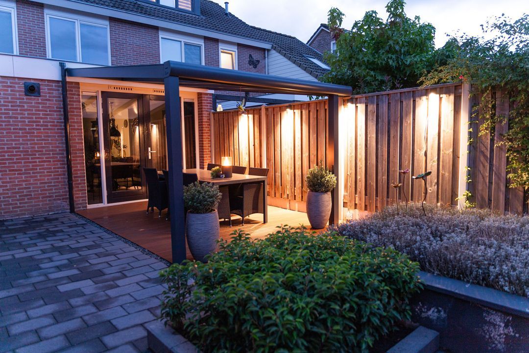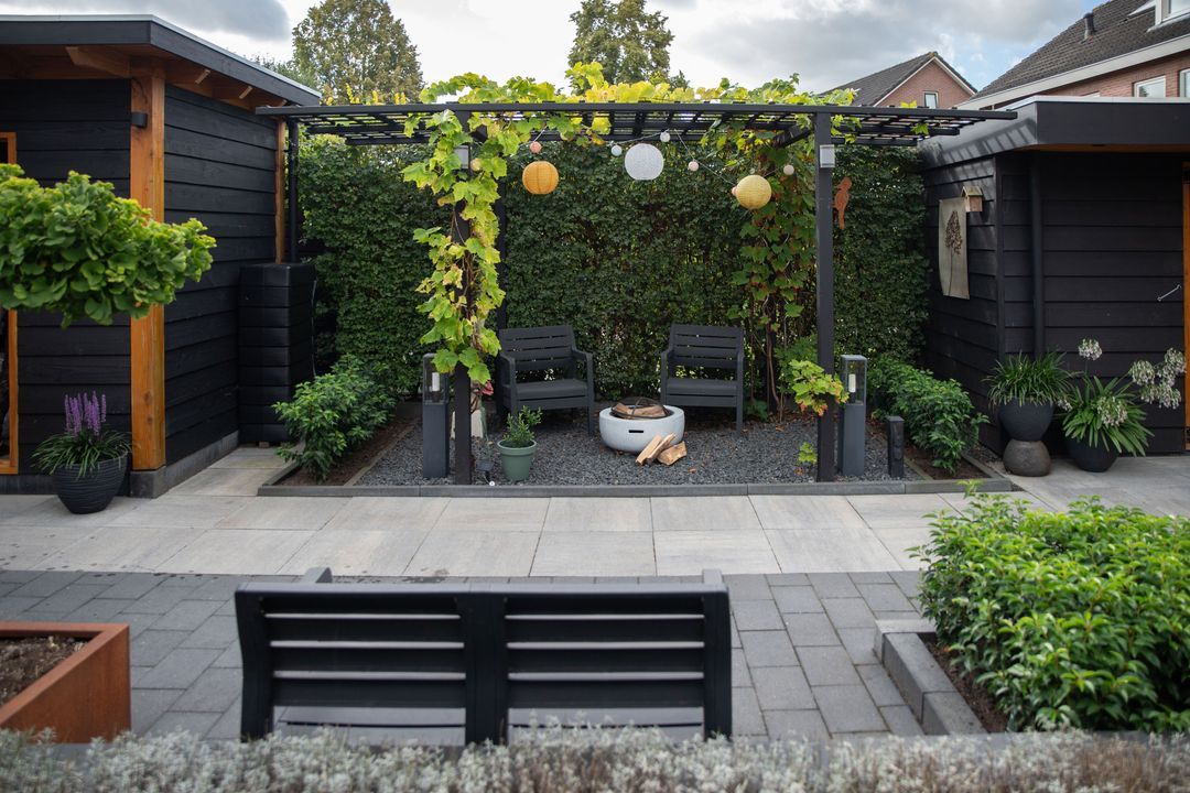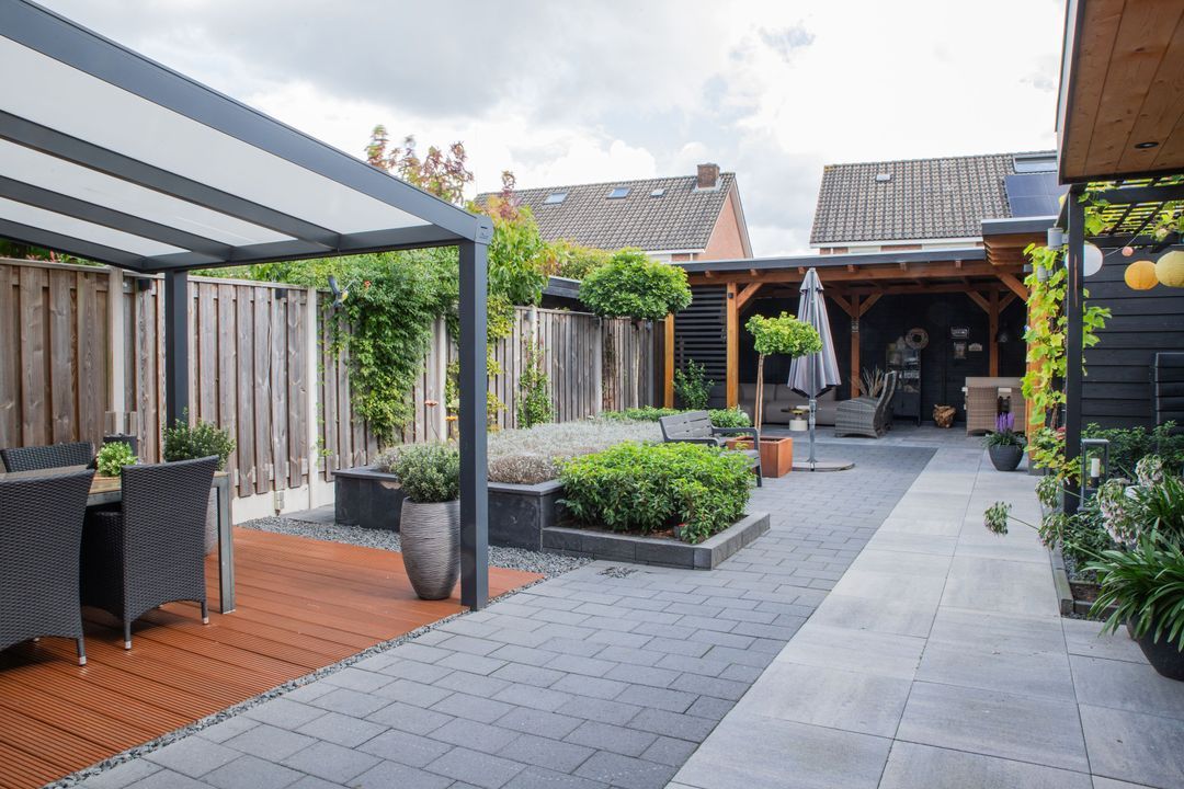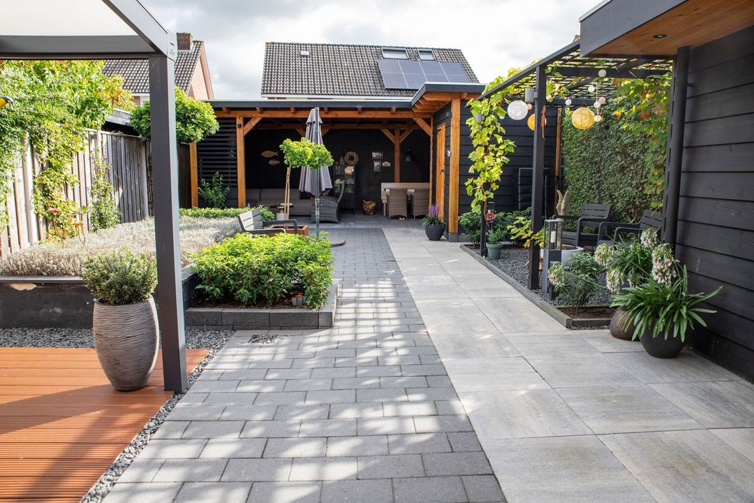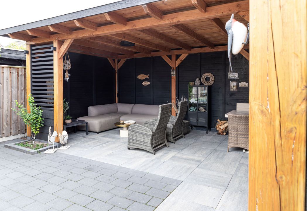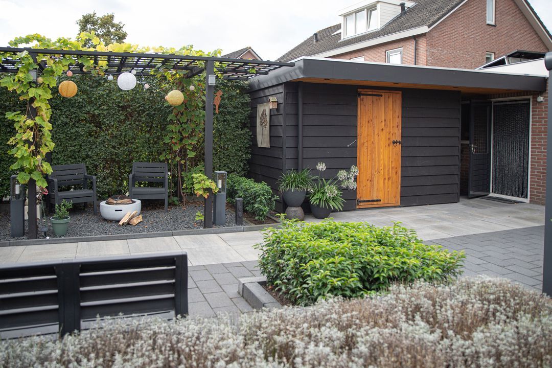 In het verlengde van de garage is een houten berging geplaatst van zwarte rabatdelen. In het overstek van het dak zijn spots aangebracht. Achter in de tuin is over de volle breedte een overkapping geplaatst. Ook hier zorgen zwarte planken en robuuste houtkleurige balken voor een sfeervol plaatje. Er is ruim plaats voor een heerlijke lounge set en een grote eettafel. Genieten dus! Deze overkapping is L-vorming opgesteld, met aangrenzend een extra berging.