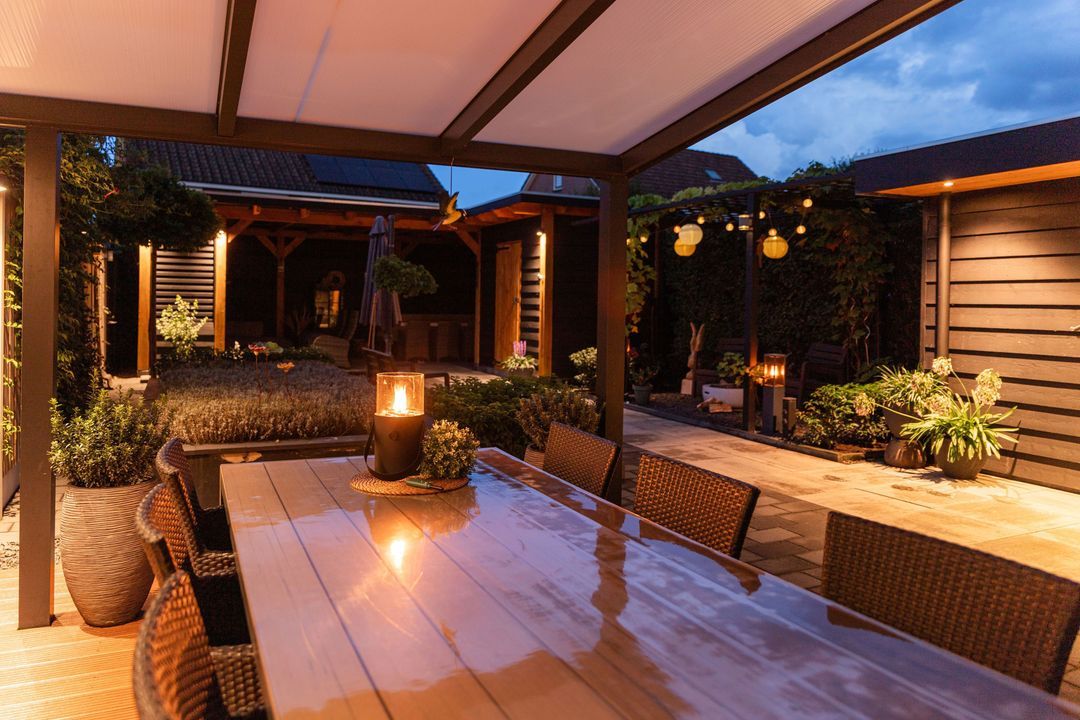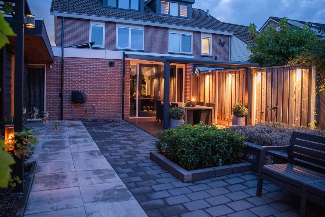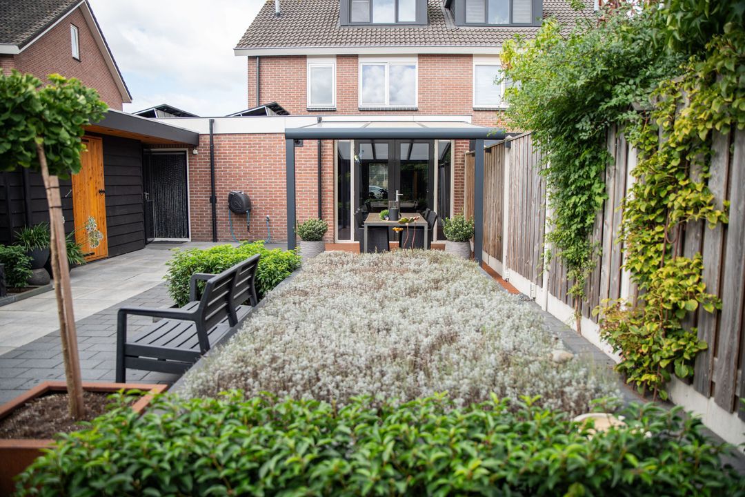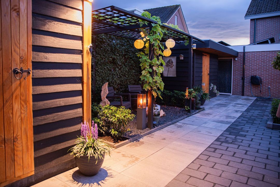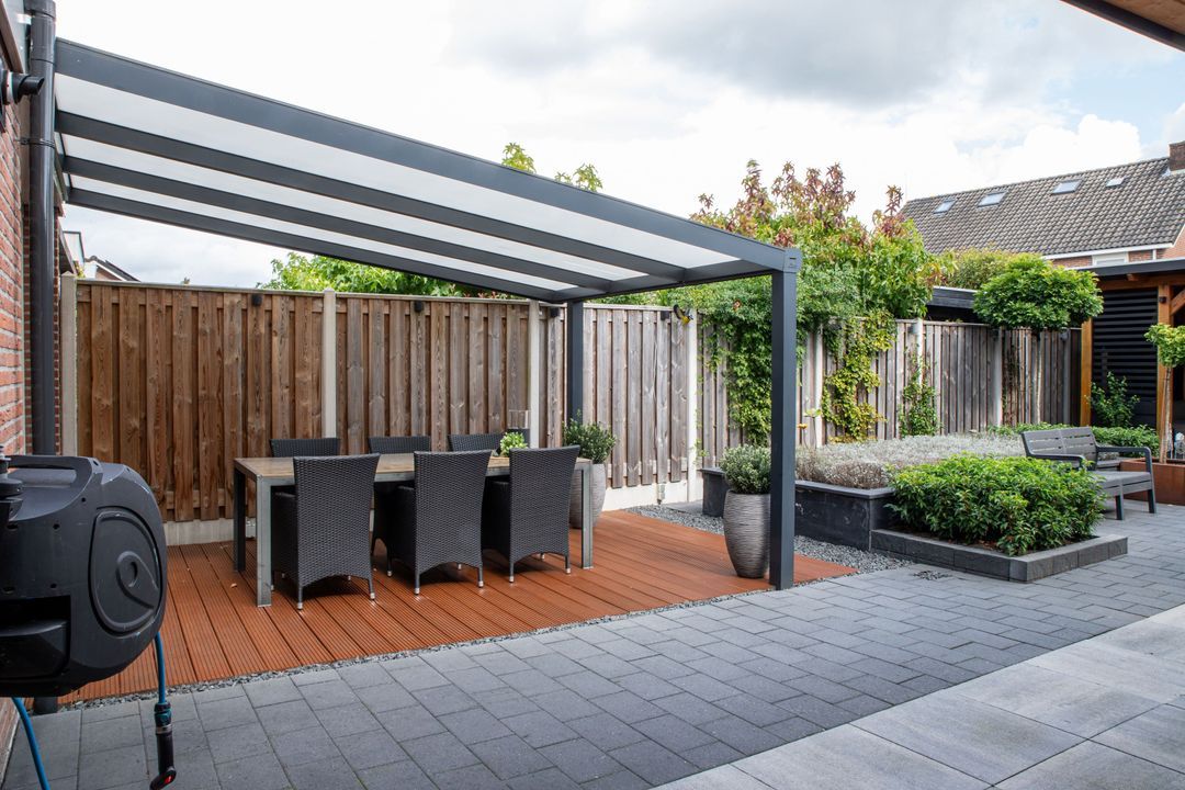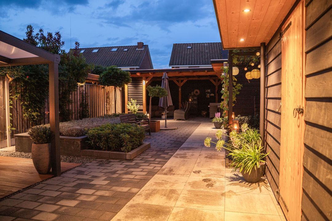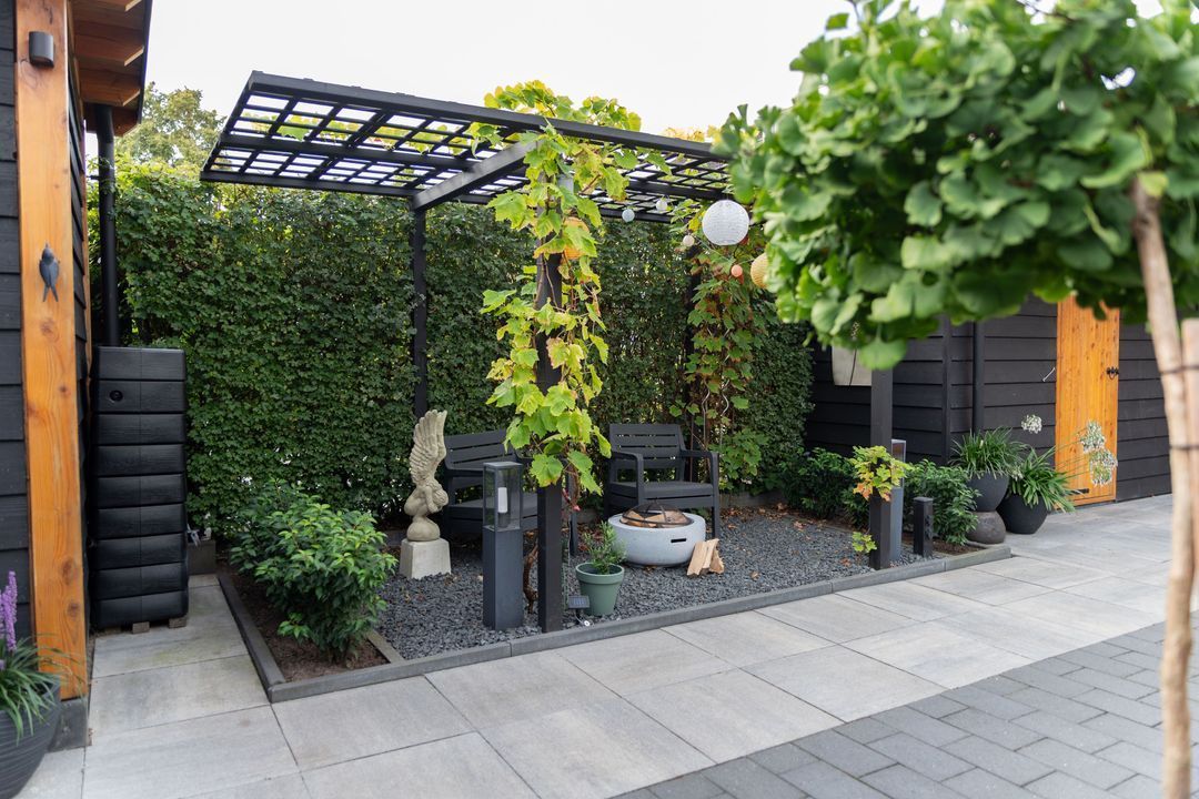 In het verlengde van de garage is een houten berging geplaatst van zwarte rabatdelen. In het overstek van het dak zijn spots aangebracht. Achter in de tuin is over de volle breedte een overkapping geplaatst. Ook hier zorgen zwarte planken en robuuste houtkleurige balken voor een sfeervol plaatje. Er is ruim plaats voor een heerlijke lounge set en een grote eettafel. Genieten dus! Deze overkapping is L-vorming opgesteld, met aangrenzend een extra berging.