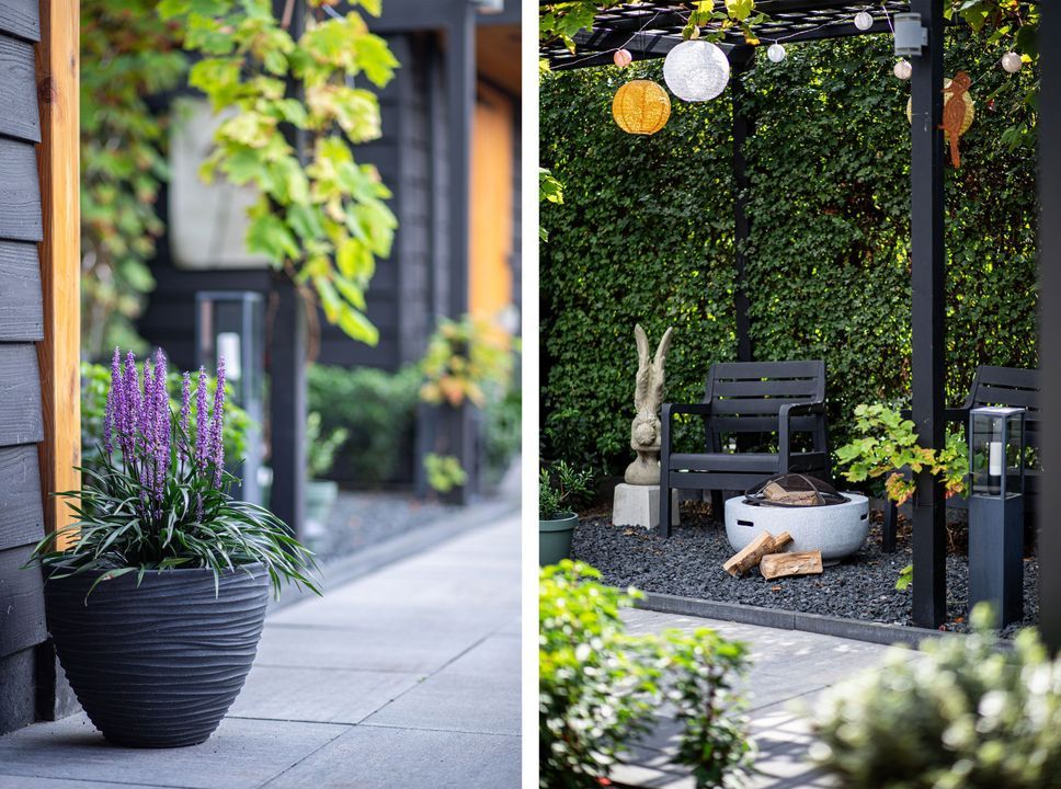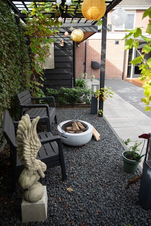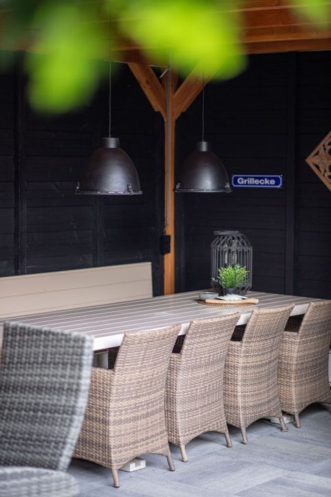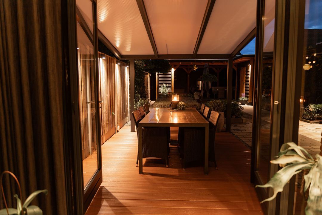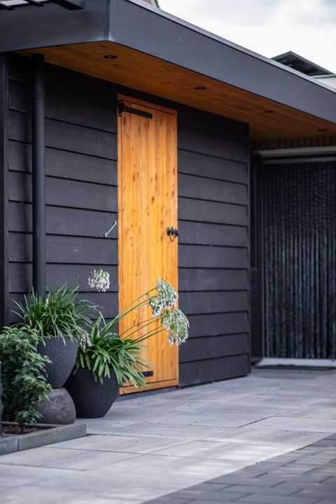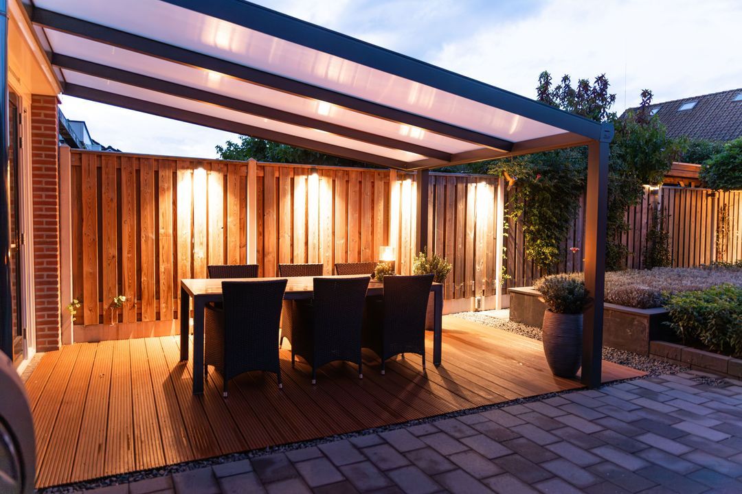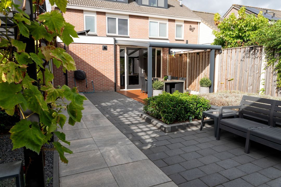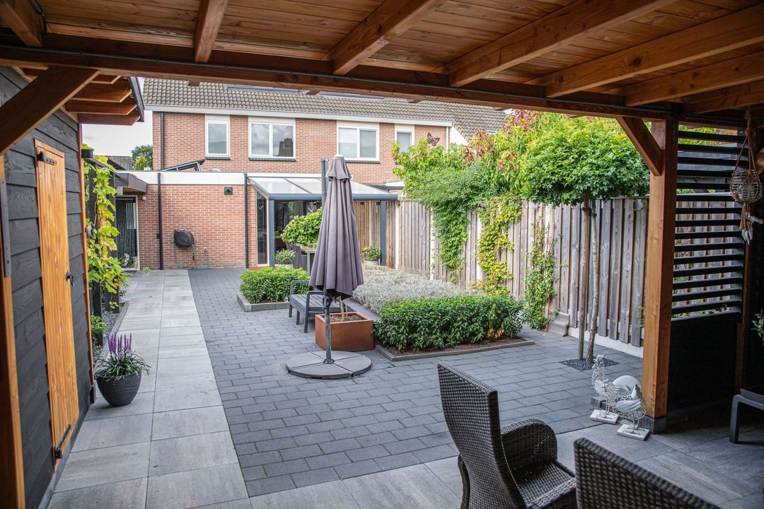 In het verlengde van de garage is een houten berging geplaatst van zwarte rabatdelen. In het overstek van het dak zijn spots aangebracht. Achter in de tuin is over de volle breedte een overkapping geplaatst. Ook hier zorgen zwarte planken en robuuste houtkleurige balken voor een sfeervol plaatje. Er is ruim plaats voor een heerlijke lounge set en een grote eettafel. Genieten dus! Deze overkapping is L-vorming opgesteld, met aangrenzend een extra berging.