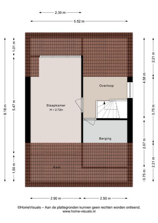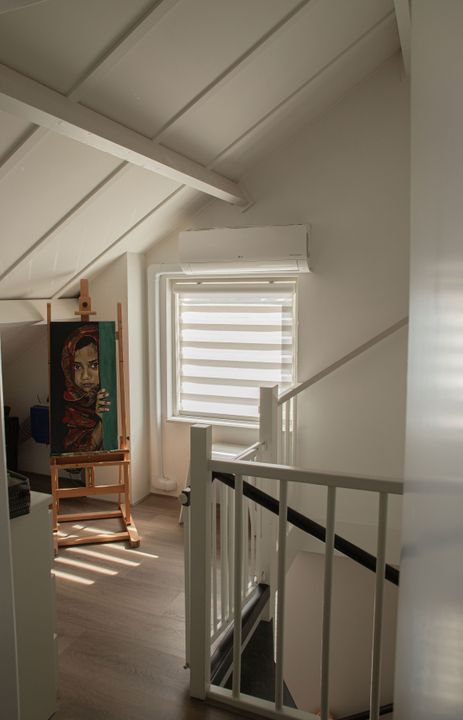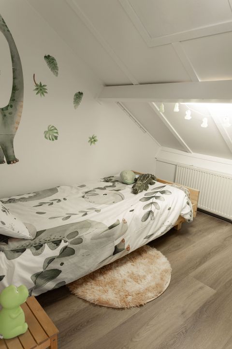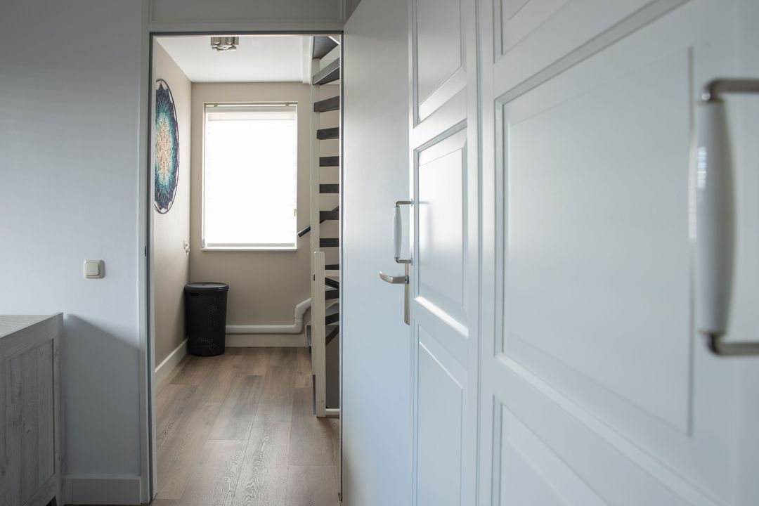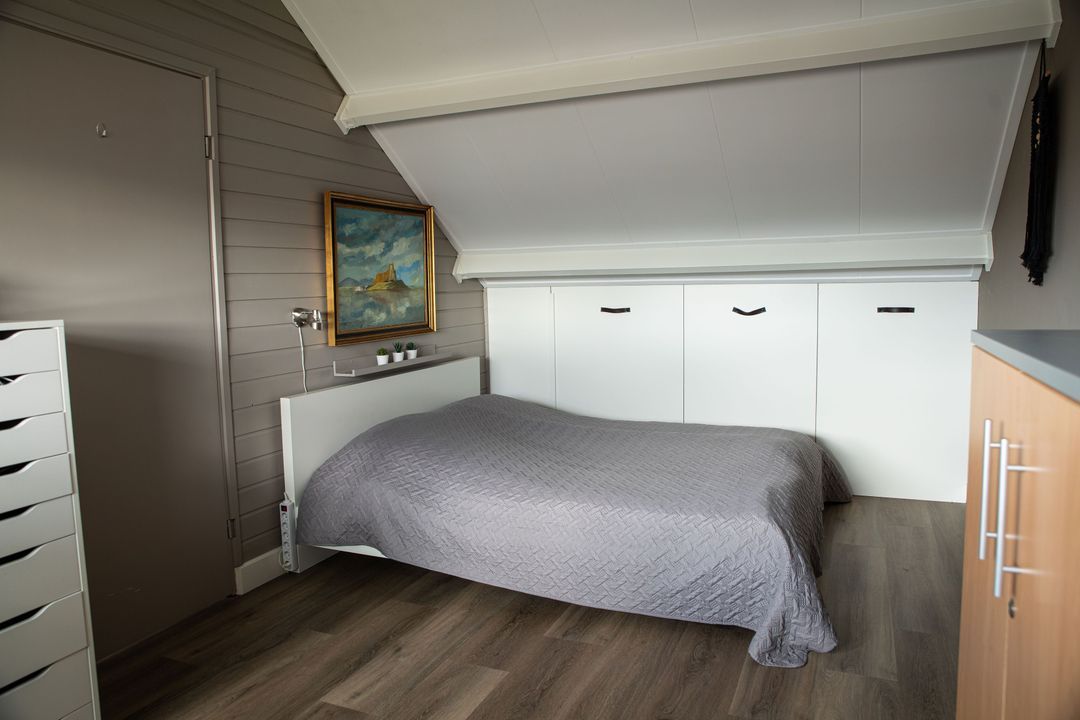 Via de gerenoveerde trapopgang wordt de voorzolder bereikt. Het raam in de zijgevel zorgt voor prettige lichtinval. Boven het raam is de tweede airco-unit aangebracht. Heerlijk comfortabel! Vanaf de voorzolder is een kleine (slaap)kamer te bereiken. De grote slaapkamer beschikt over een dakkapel met kunststof draai/kiepramen. Onder de knieschotten is praktische bergruimte gerealiseerd.