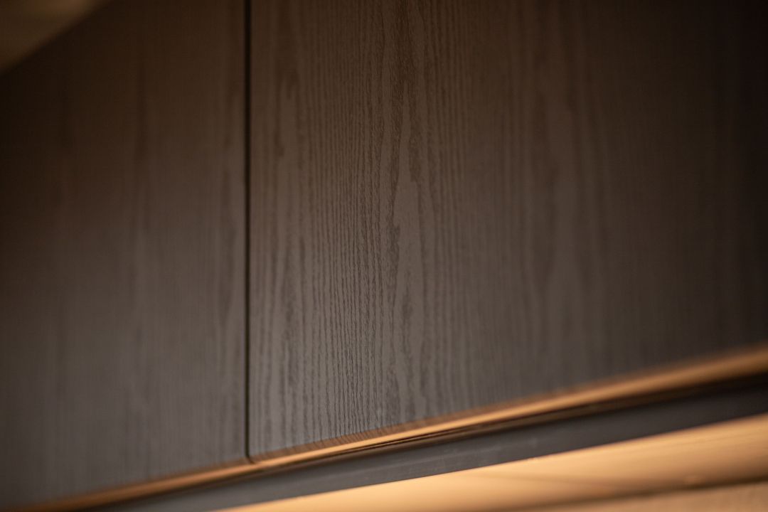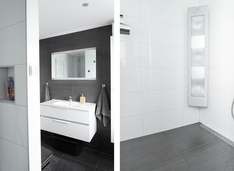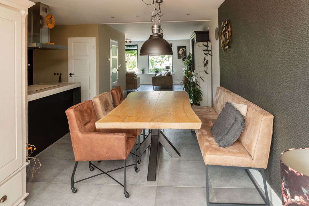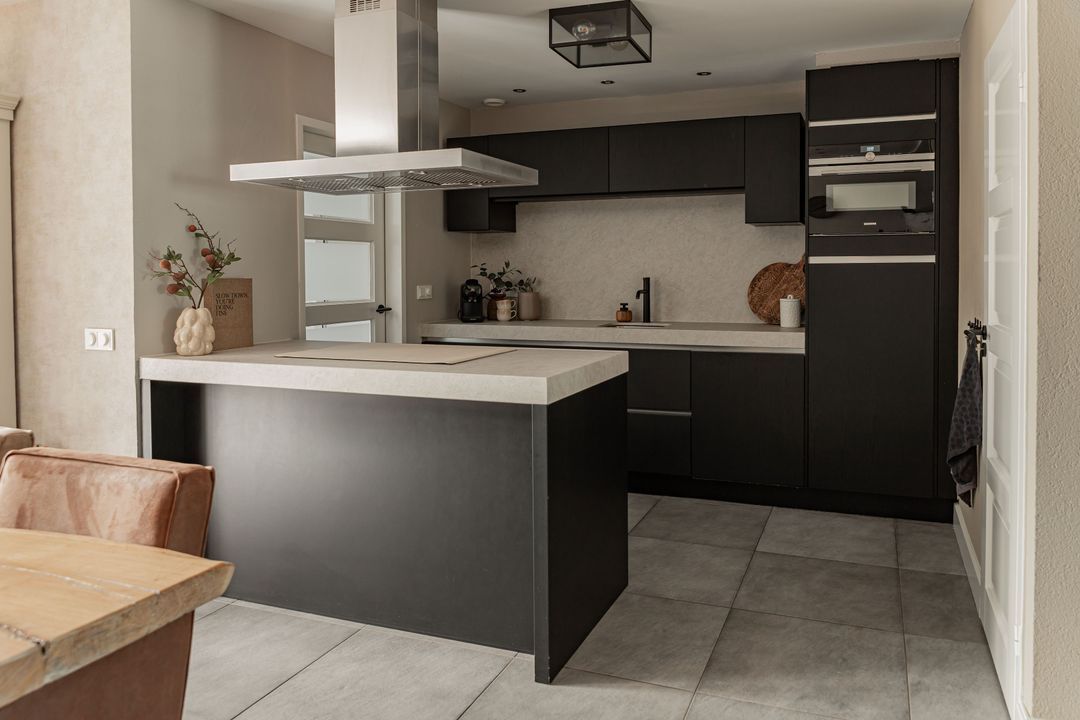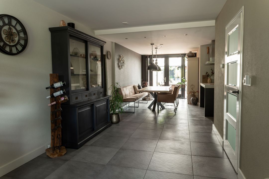 Aan de achterzijde tref je de woonkeuken met schiereiland. Deze is strak uitgevoerd met greeploze laden en deuren en afgewerkt met een dik aanrechtblad. Erg praktisch in de vaste kast die in extra bergruimte voorziet. Er is ruim plaats voor een grote eettafel. De gehele begane grond is voorzien van grote vloertegels, met daaronder vloerverwarming. Door de optimale vloerisolatie (Tonzon), is het extra comfortabel. Dit geldt overigens voor de gehele woning, goede isolatie en HR++ glas.