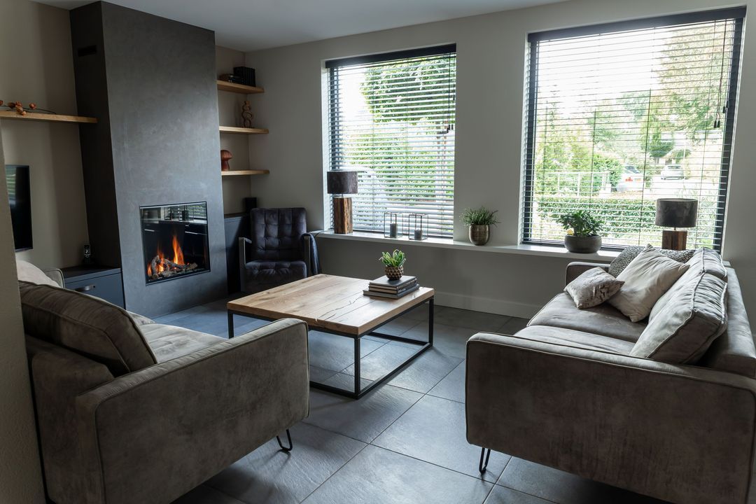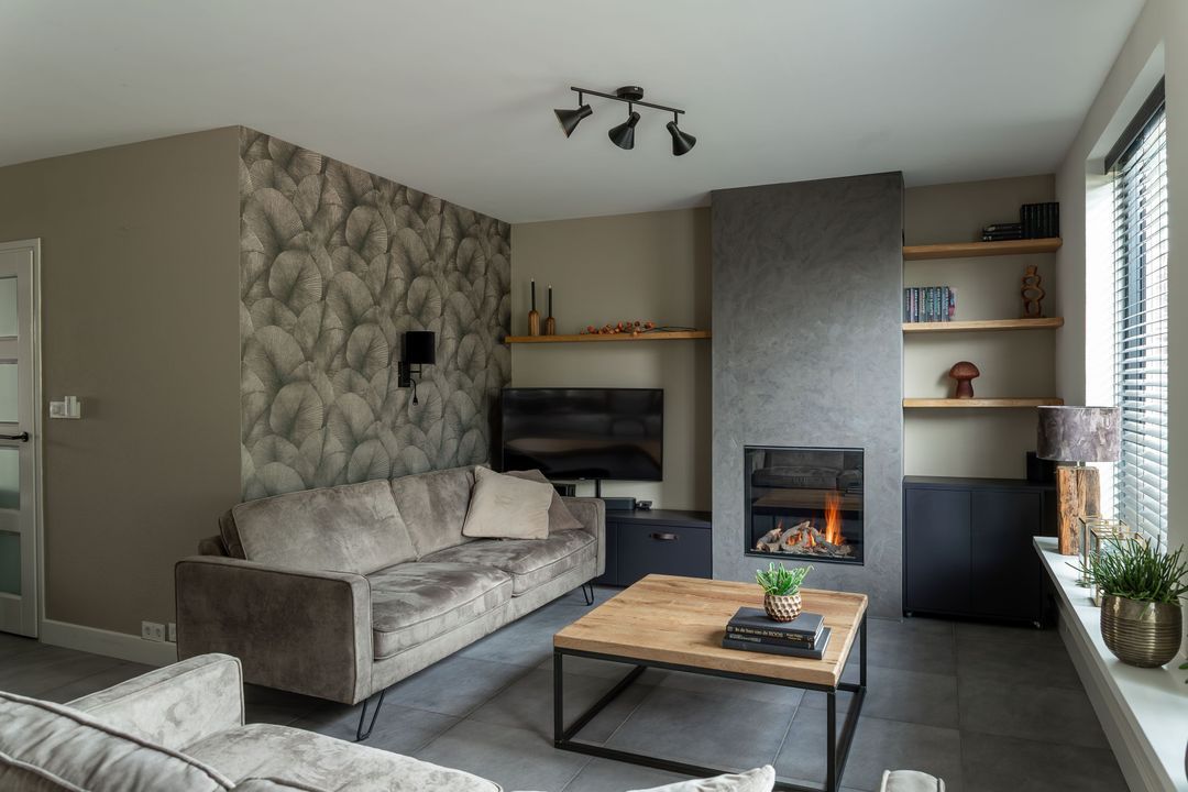 Vanuit de hal is er toegang tot de woonkamer, door de deur met glaspanelen. Hierdoor wordt de lichtinval optimaal benut. De straatgerichte woonkamer biedt fraai zicht op het ervoor gelegen groen en speelveld. Er is een sfeervolle gashaard aangebracht, die als een ‘kolom’ doorloopt tot aan het plafond.