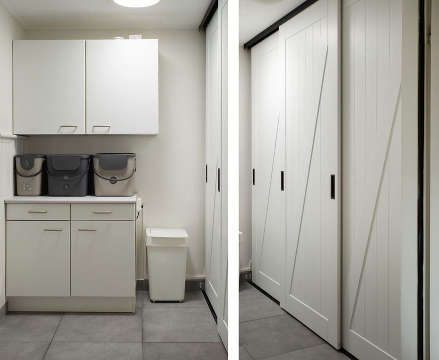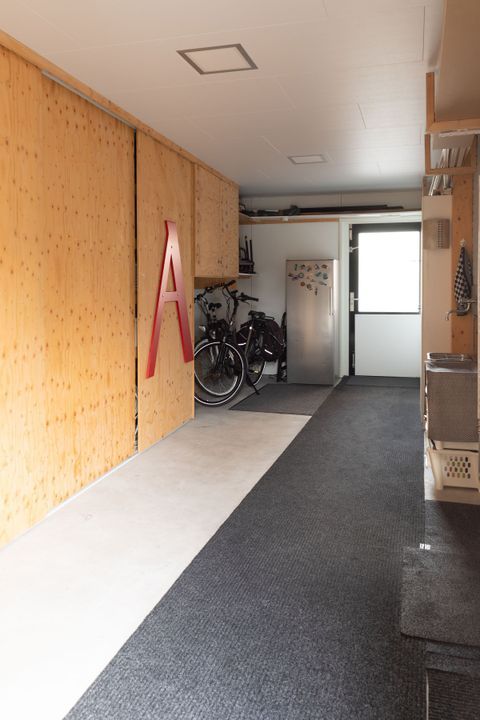 Via de tussendeur, met eveneens glaspanelen, wordt de bijkeuken bereikt. Hier is een klein keukenblokje opgesteld en achter prachtige schuifdeuren is het witgoed verwerkt. Vanuit de bijkeuken is de garage inpandig te bereiken. De wanden en het plafond zijn keurig afgewerkt en de ruimte is voorzien van kastruimte met schuifdeuren. Via twee enkele loopdeuren zijn van hieruit de oprit en de achtertuin te bereiken. Er is een spoelbak aanwezig, met warm en koud water.
