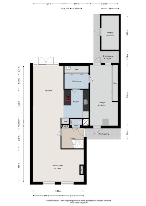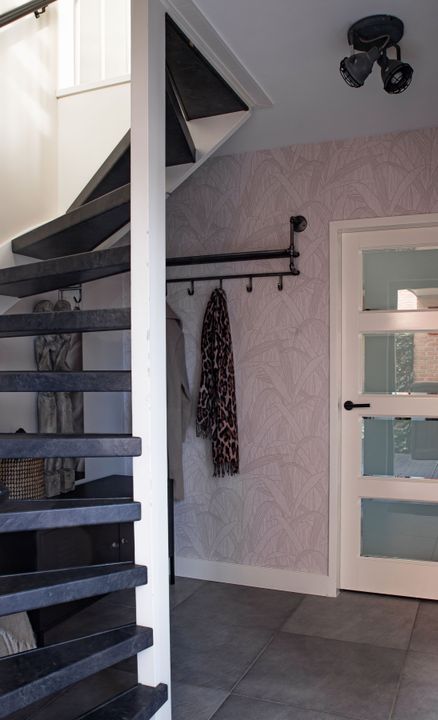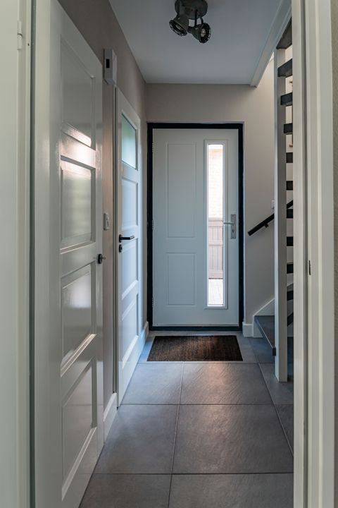 Jouw auto parkeer je op eigen terrein. Onder het overstek van het garage dak bereik je de entree in de zijgevel van de woning. Vanuit de hal bereik je het toilet en is er toegang tot de meterkast. He toilet is keurig betegeld en is voorzien van een wandcloset. Onder de open trapopgang is er ruimte voor de jassen.