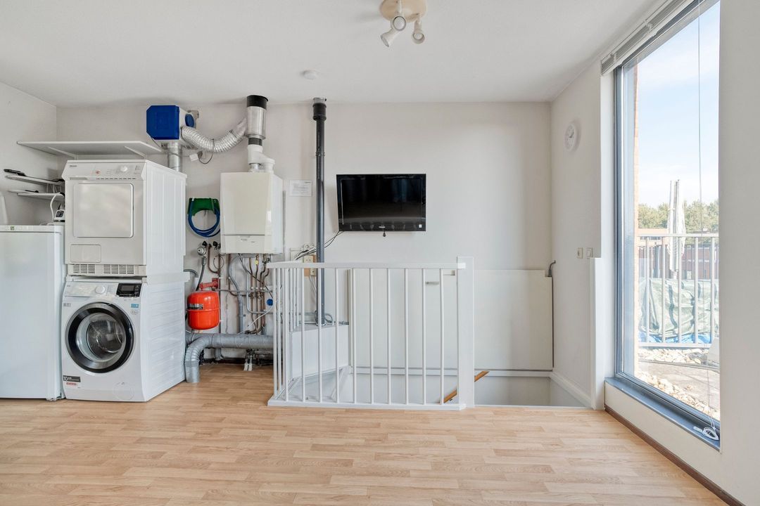 Meteen naast de trapopgang is de wasmachineaansluiting aangebracht en centrale afzuiging voor het gehele huis. Er is een tappunt voor warm en koud water aanwezig. Hier is ook ruimte voor een droger en zelfs nog voor een extra koelkast of vriezer. De cv-ketel van het merk Remeha, het zwaardere type CW4. Aan de andere zijde van de ruimte bevindt zich achter het gordijn bergruimte op legplanken. Deze verdieping leent zich uitstekend om er een tweetal slaap- of hobbykamers met dakterras te maken.