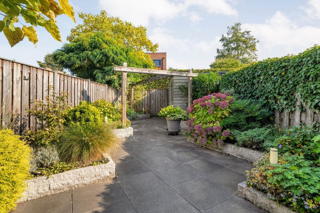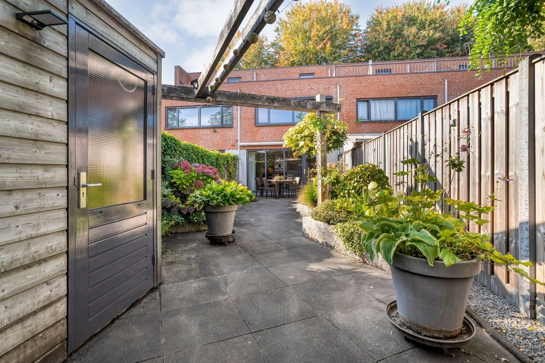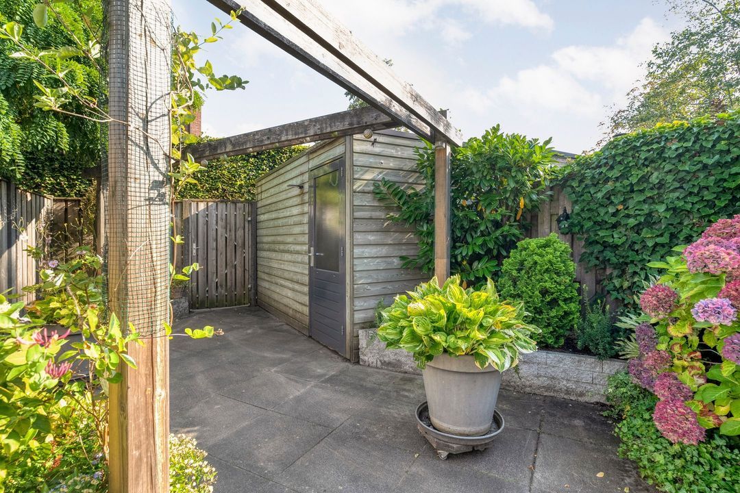 De diepe tuin (voorzien van elektra en buitenkraan) ligt op het zonnige zuidoosten en is bereikbaar via een achterom. Achter in de tuin is een houten schuur geplaatst, voorzien van elektra. De 16 meter diepe tuin is speels aangelegd met een prettige afwisseling tussen groen en terras. Een robuuste pergola onderbreekt de lengte van deze diepe tuin. Op het terras, grenzend aan de woonkamer, is er ruim plaats voor een heerlijke tuinset.