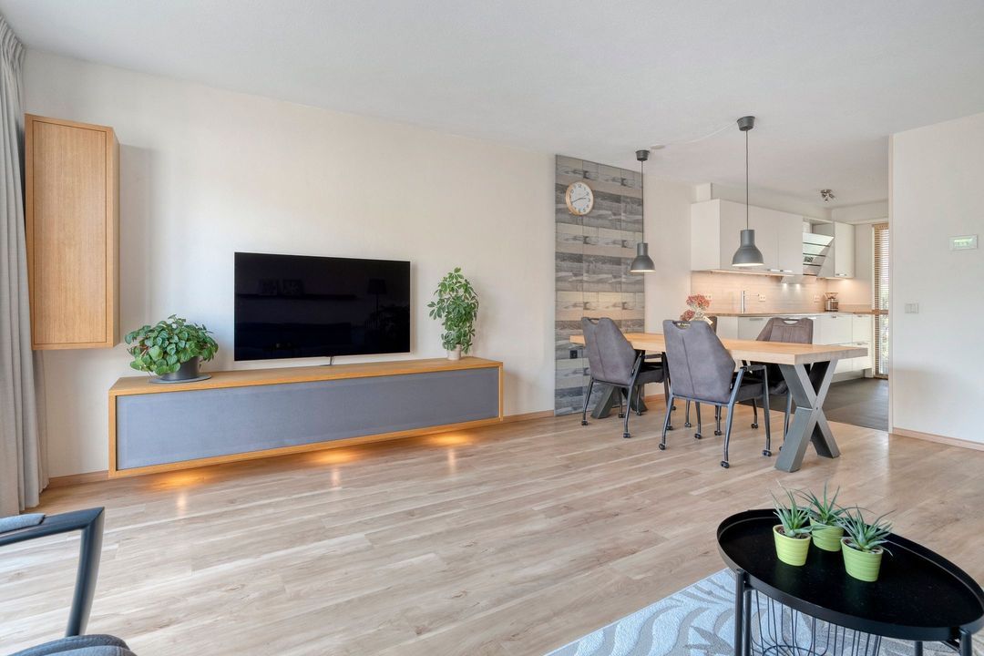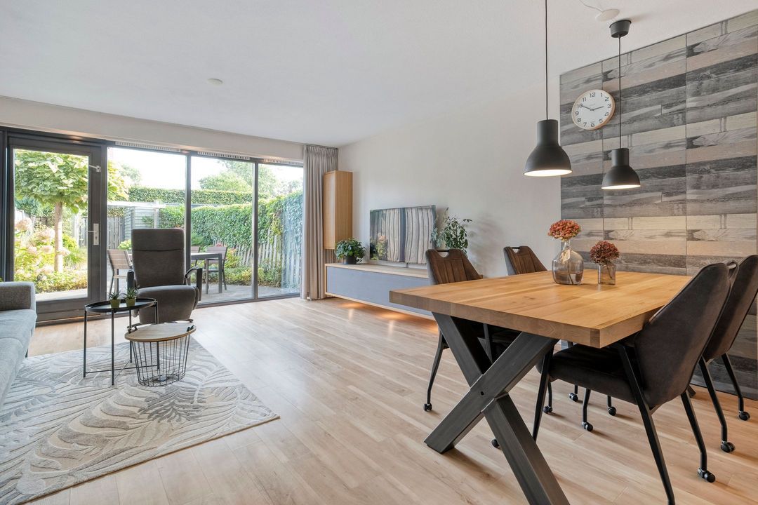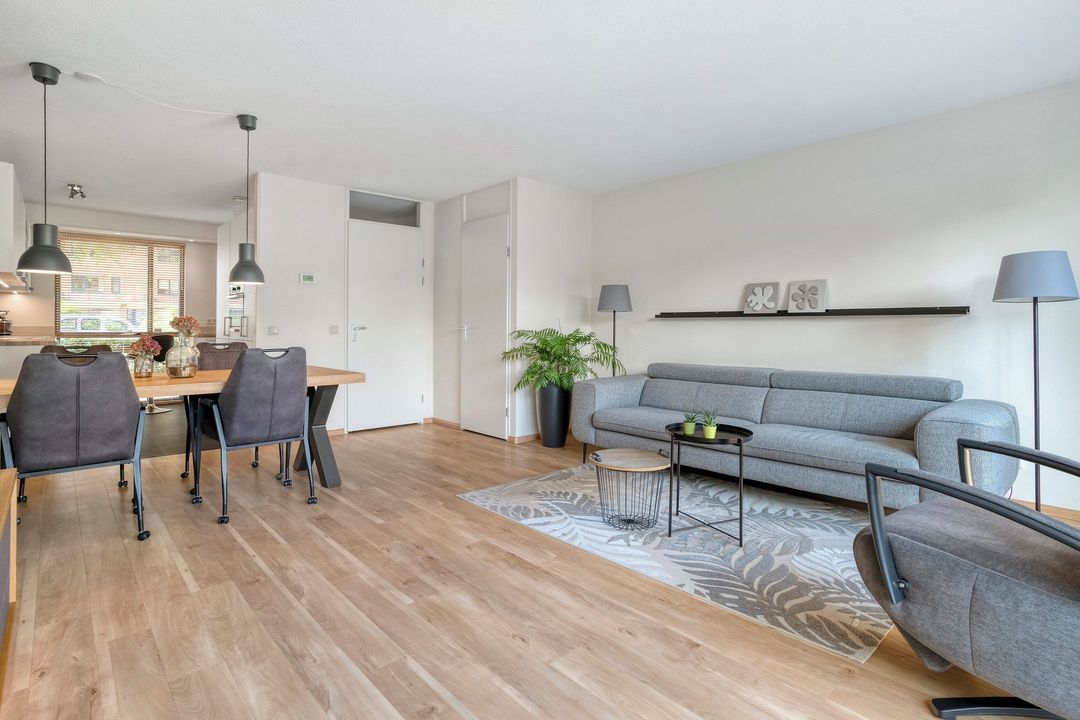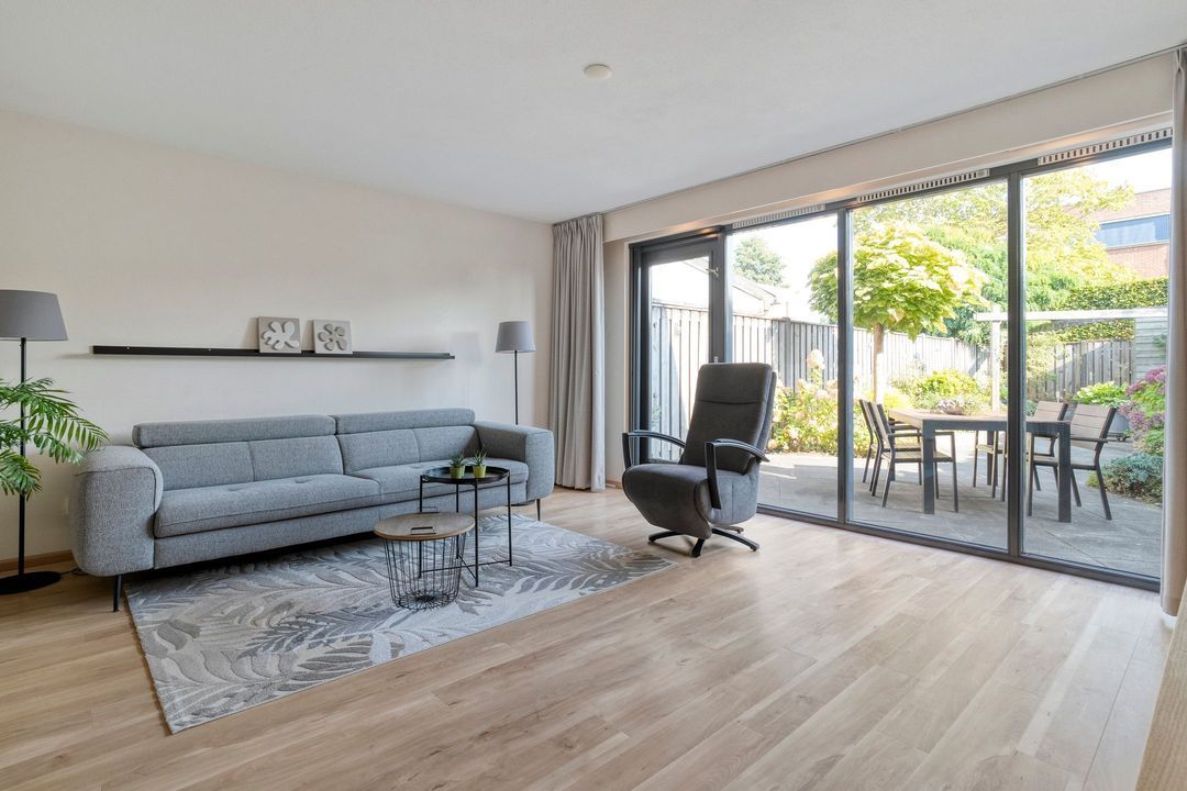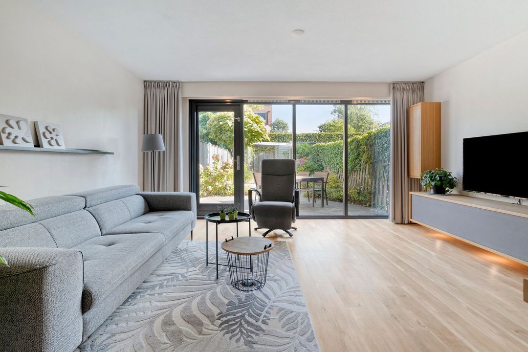 Bij het binnenkomen van de op het zuidoosten gerichte woonkamer van ca. 30 m2 valt direct de hoeveelheid lichtinval op. De woonkamer is voorzien van vloerverwarming. De verdiepingshoge ramen van de achtergevel zorgen voor veel licht en prachtig zicht op de diepe tuin. De tuin die veel privacy biedt om heerlijk van de zon te genieten. Aan de achtergevel is een zonnescherm aangebracht.