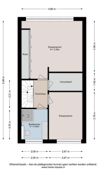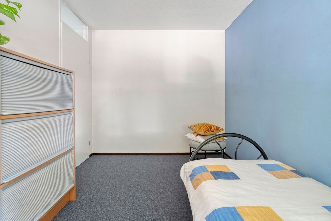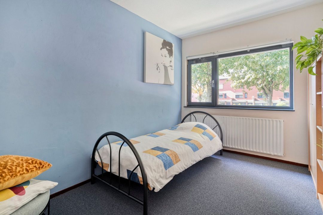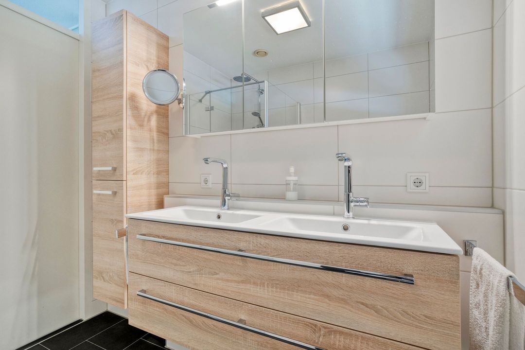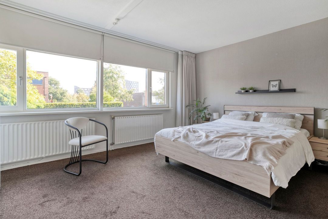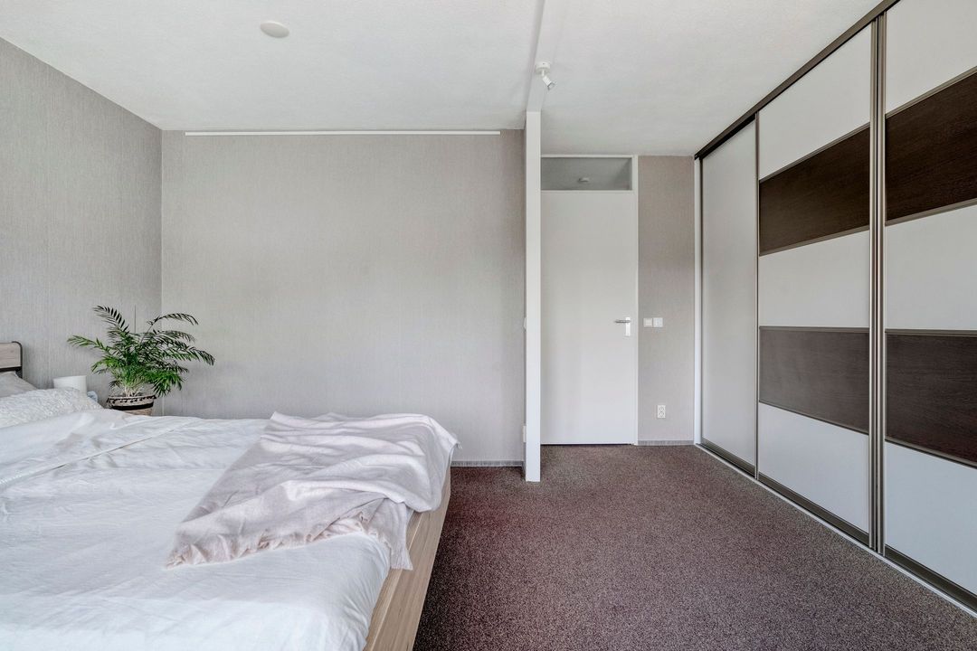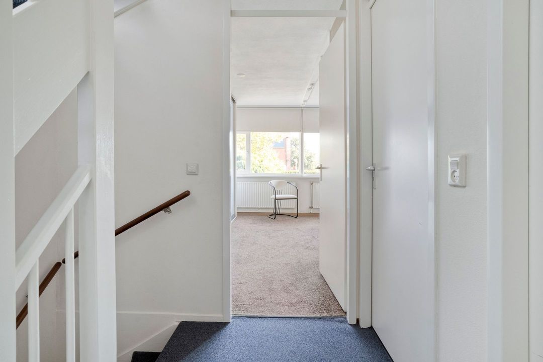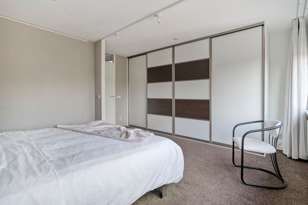 Via de trap naar de overloop bereik je de twee slaapkamers en de badkamer op deze verdieping. Tussen de twee slaapkamers is een inloopkast aangebracht. De slaapkamer aan de rustige achterzijde heeft een vorstelijk formaat van 21 m² en is voorzien van elektrisch bedienbare buitenzonwering. In deze kamer is een brede verdiepingshoge schuifdeurkast geplaatst met veel hang- en legruimte. Voorheen waren dit twee slaapkamers, die eenvoudig weer in deze staat terug te brengen zijn.