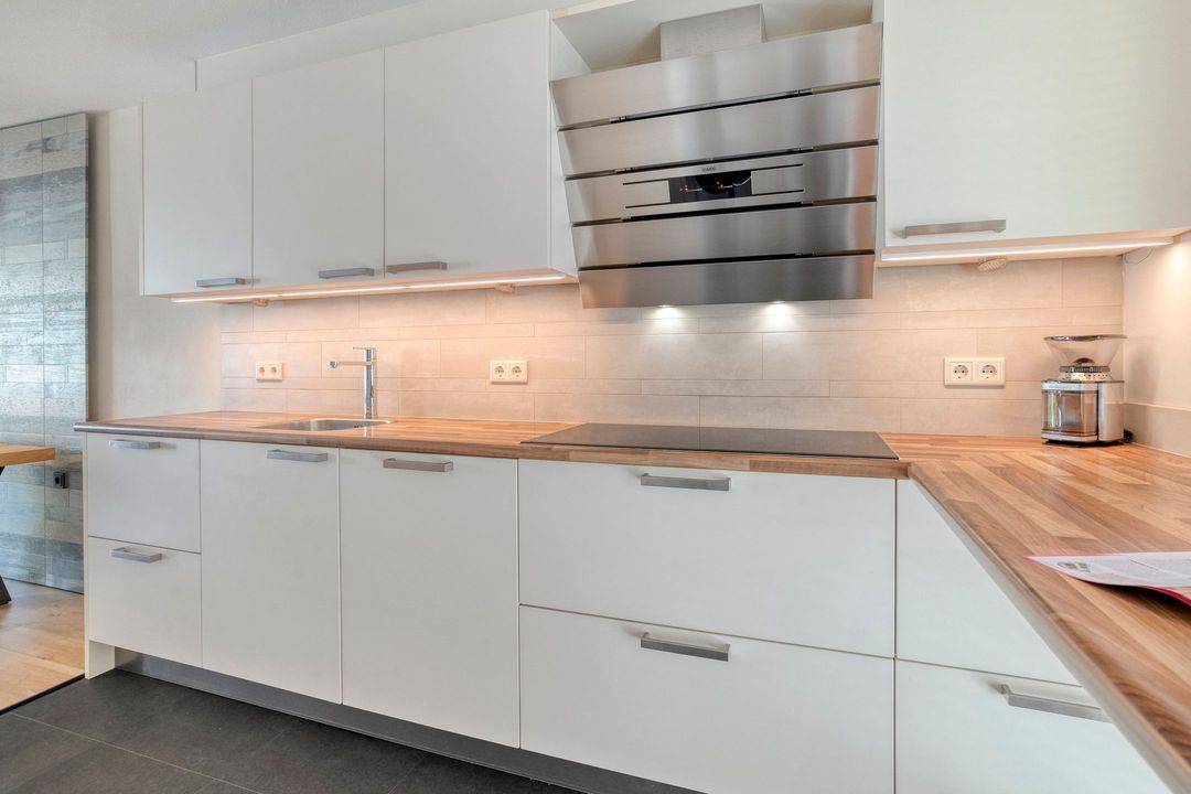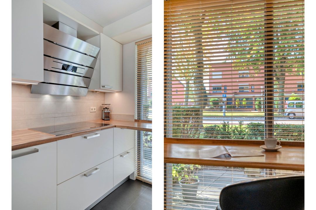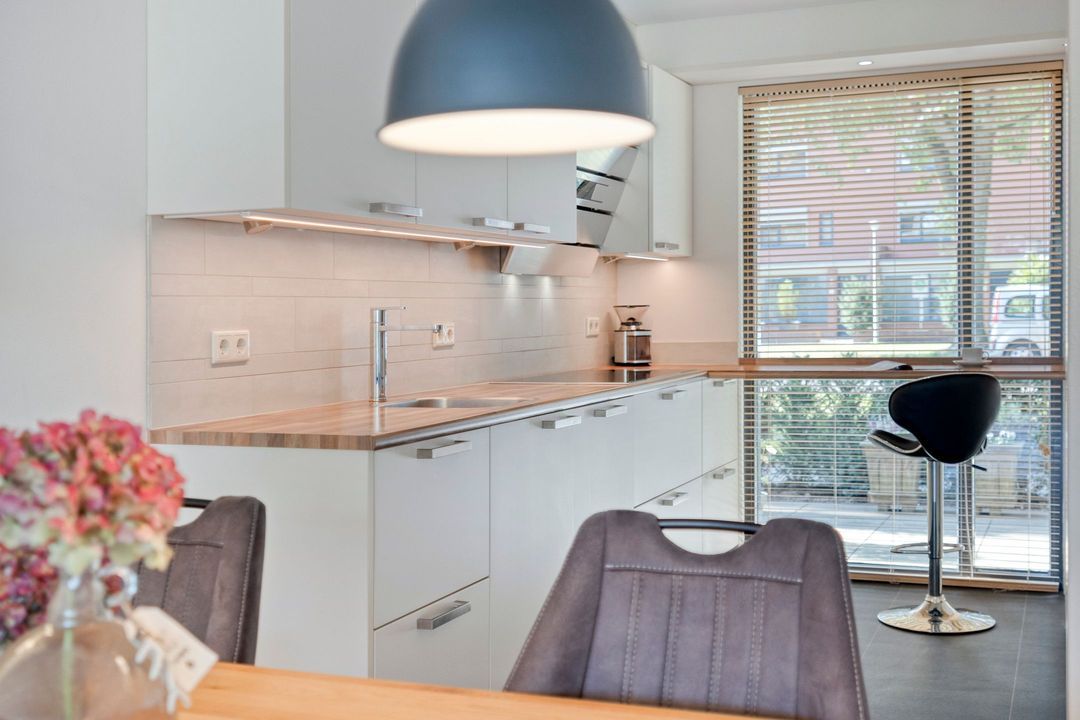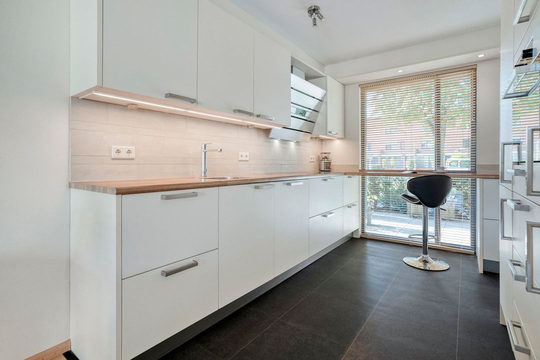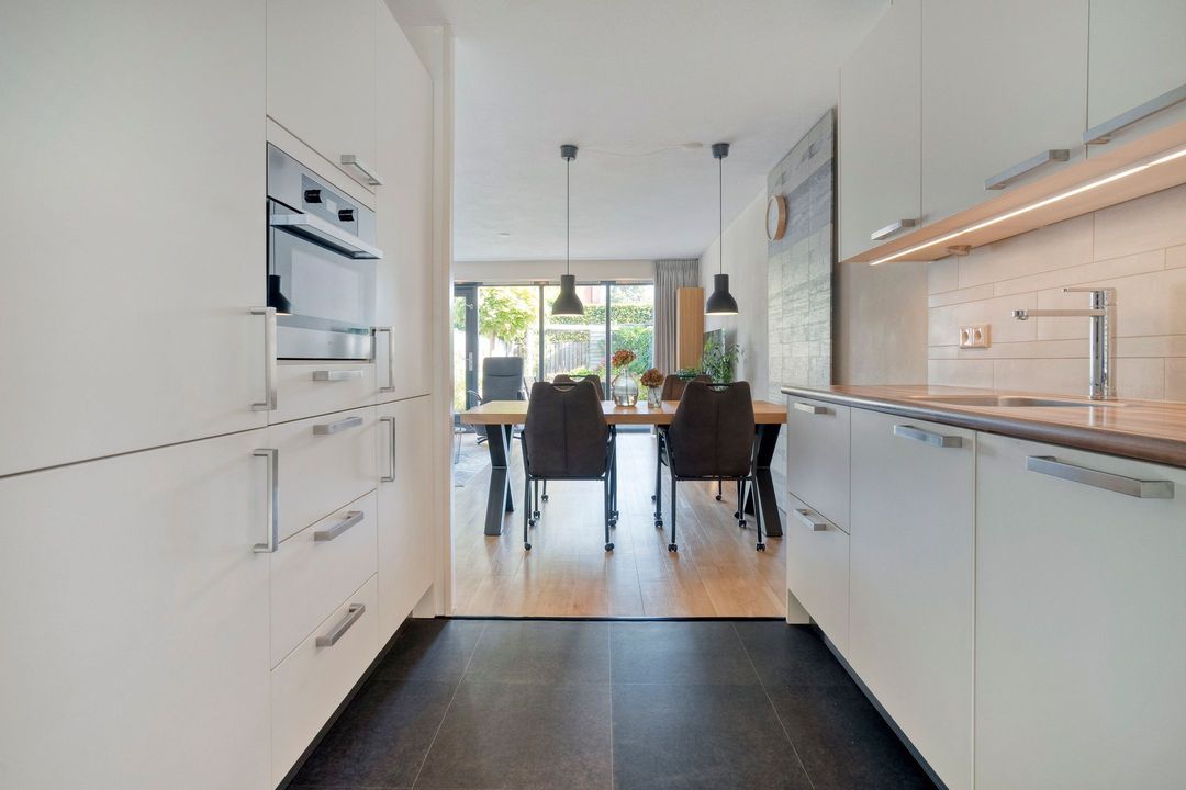 Aan de woonkamer verbonden ligt de moderne open keuken die opgesteld is in twee gedeelten. Langs de lange wand zijn de 5-zones inductiekookplaat, afzuigkap, afwasmachine en het spoelgedeelte aangebracht. In het tegenover gelegen deel is een koel-vriescombinatie en nieuwe combi-oven geplaatst. Hier is ook veel kastruimte voor servies en proviand. Het werkblad is doorgetrokken langs het raam en biedt hierdoor een mogelijkheid voor een gezellige zitplek of extra werkruimte. Onder de trapopgang bevindt zich een praktische trapkast voor extra bergruimte.