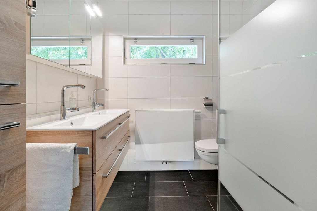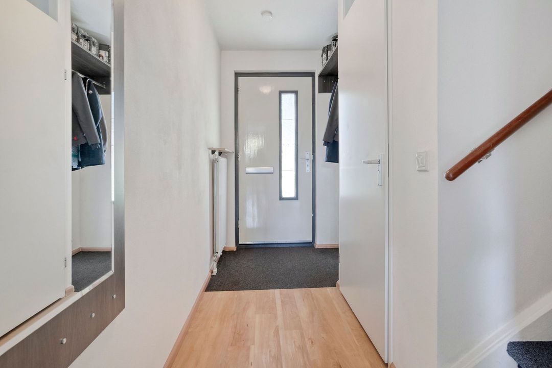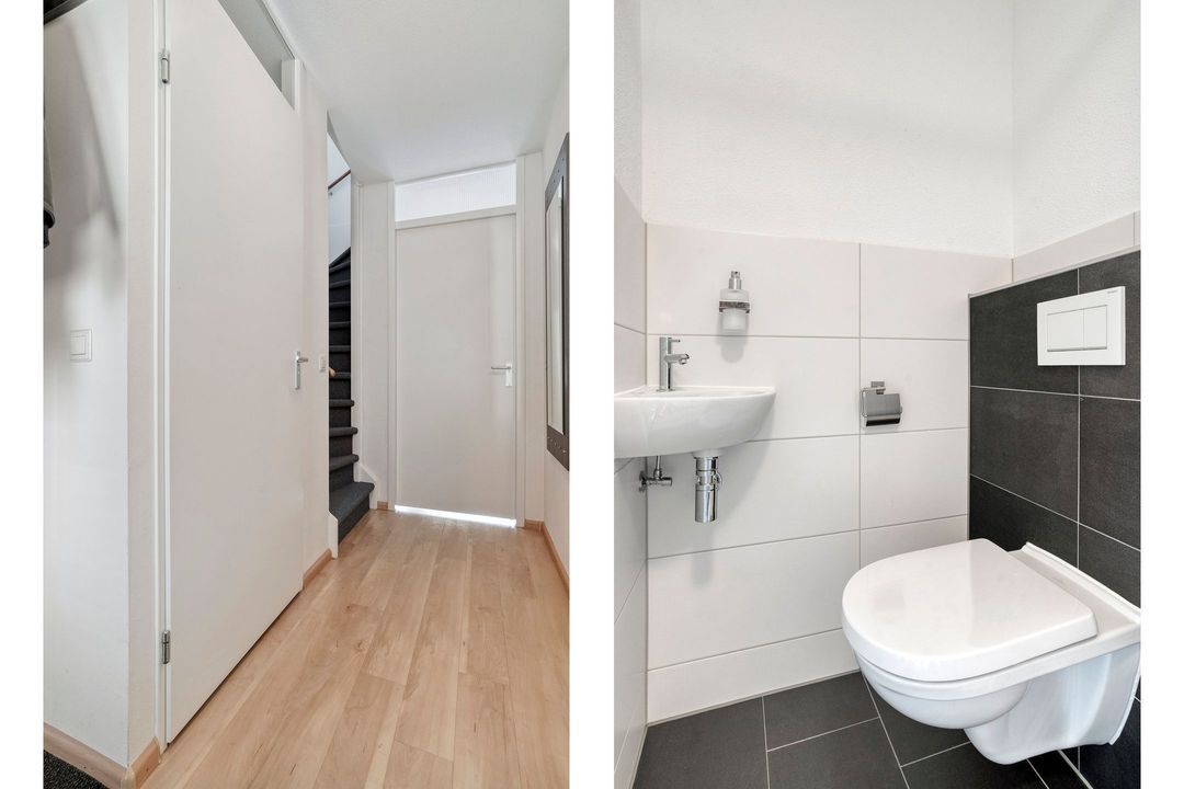 Je auto parkeer je op een openbare parkeerplaats in de straat voor de woning. Er bevindt zich een openbare EV-oplaadplek aan de overkant van de straat. Via de brede groenstrook kom je via de keurige voortuin bij de voordeur. Bij binnenkomst vind je direct links de meterkast met glasvezel/CAI en 3-fasenaansluiting. Ernaast bevindt zich het gerenoveerde toilet, keurig betegeld en voorzien van een wandcloset met fonteintje.