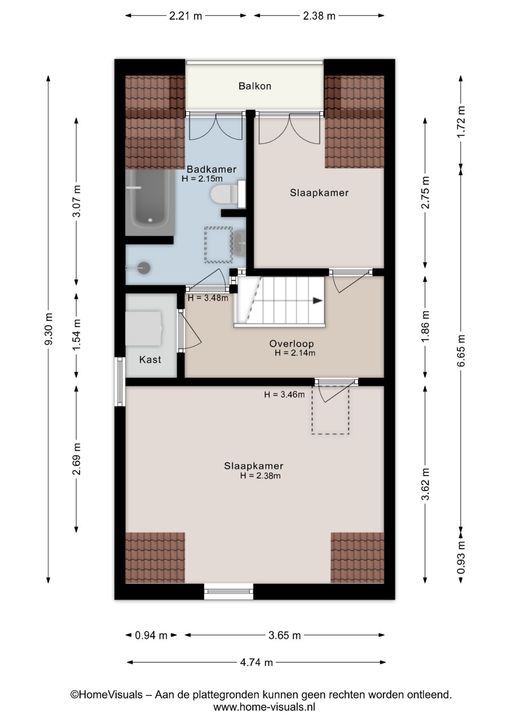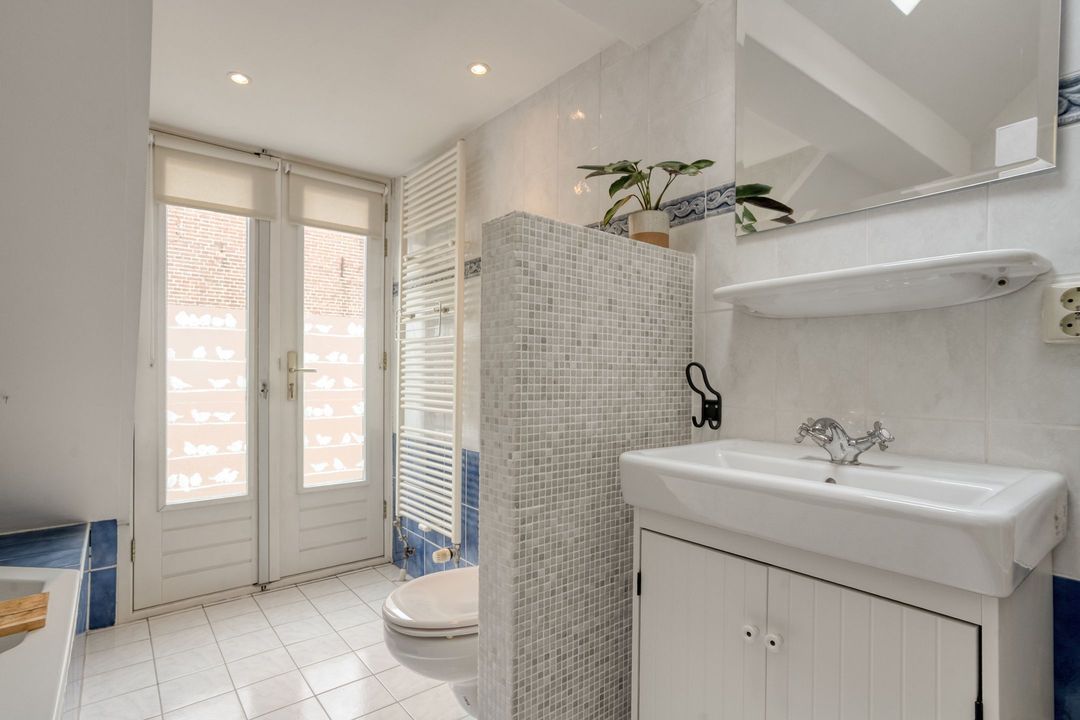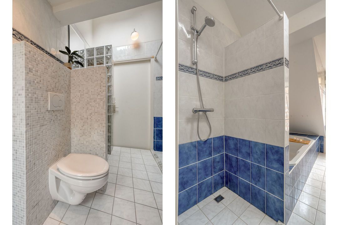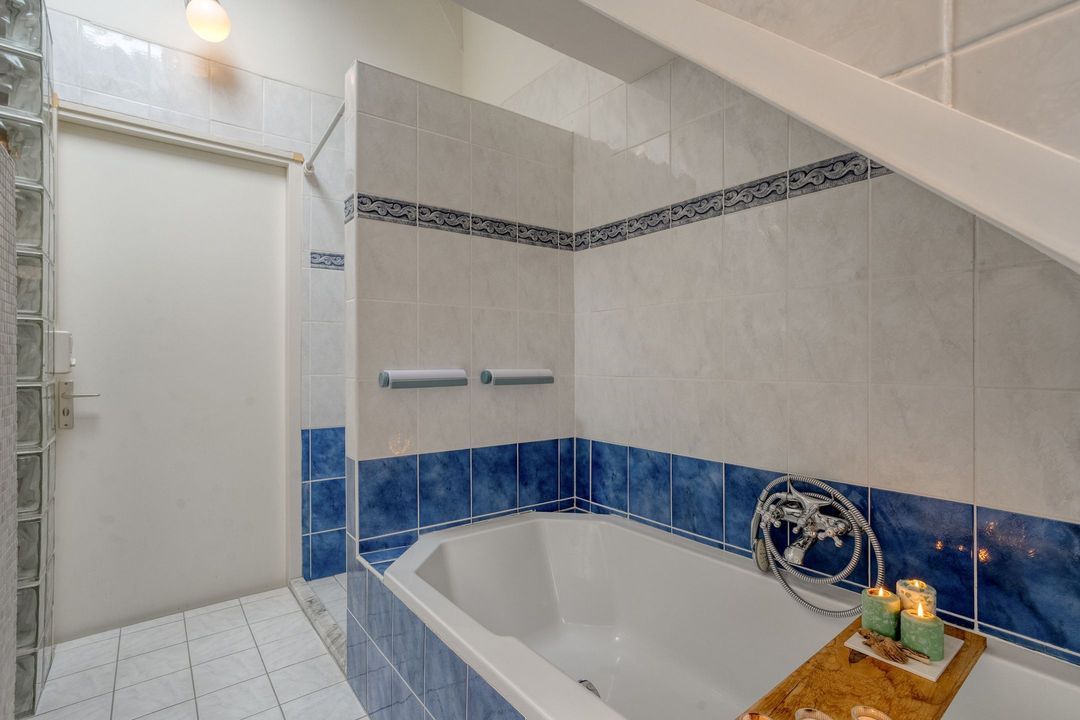 Aan de achterzijde zijn de tweede (slaap)kamer en de badkamer te vinden. Samen delen ze de dakkapel. Vanuit beide vertrekken bieden dubbele tuindeuren toegang tot het stukje platte dak achter de dakkapel. De badkamer is ruim en beschikt over een 2e toilet, een wastafel met meubel, een separate douche en een groot ligbad.