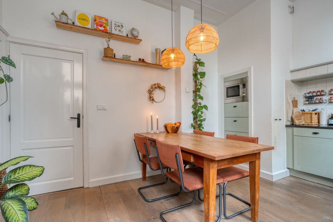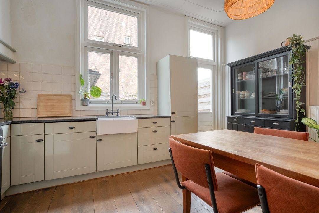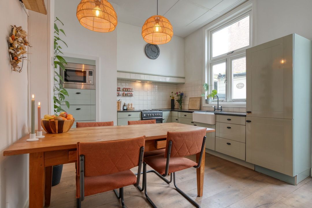 De woonkeuken bevindt zich aan de achterzijde en staat in verbinding met de sfeervolle tuin. Deze ruimte heeft een oppervlakte van ca. 16 m² en voelt door het hoge plafond erg ruim. Alles klopt, hoog plafond, keuken in stijl, de oude (look) tegels op de achterwand, de houten vloer, ruimte voor een grote eettafel.