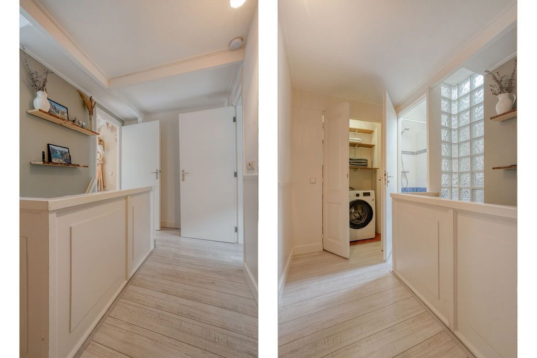 Via de woonkamer wordt de trap naar de verdieping bereikt. De ruime overloop dankt zijn lichtinval aan de glazen bouwstenen vanuit de badkamer. Achter de dubbele deuren is vanaf de overloop de wasruimte te bereiken. Hier is ruim plaats voor de wasmachine- en droger. Ook biedt deze vaste kast extra bergruimte.