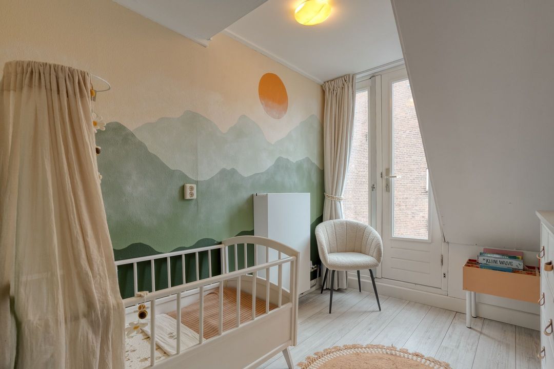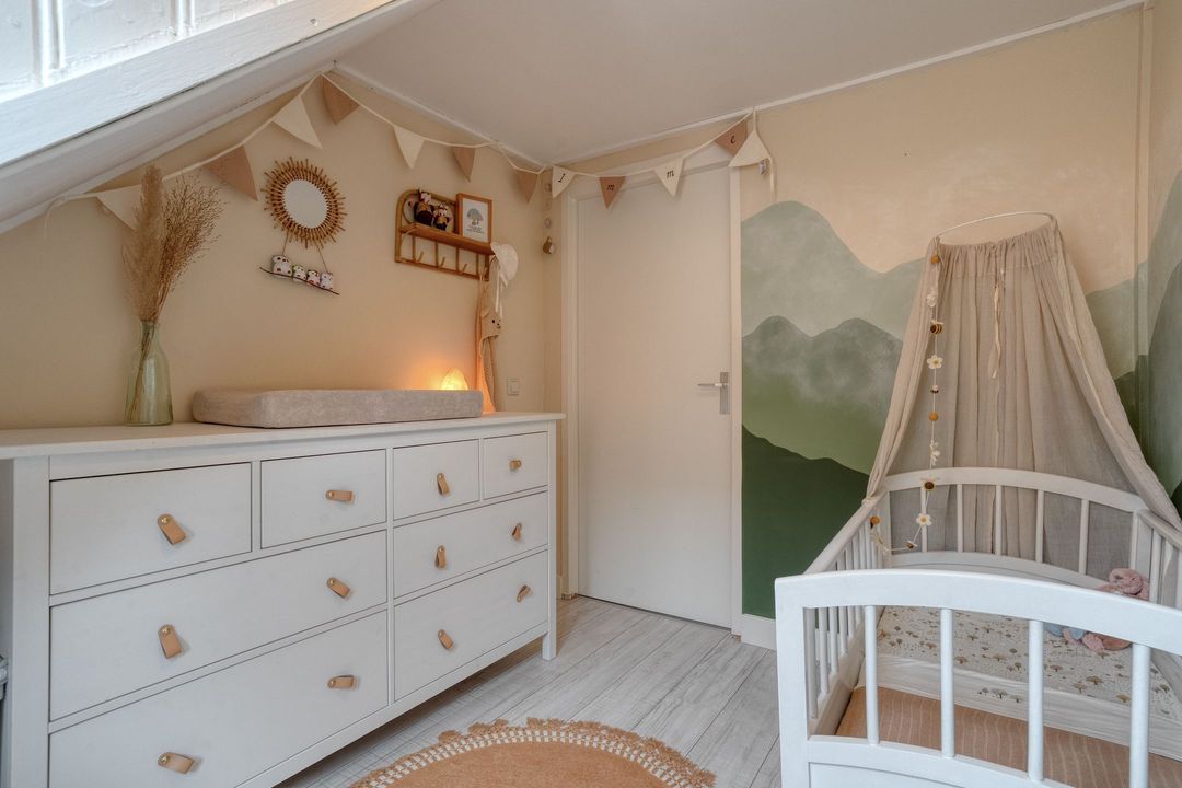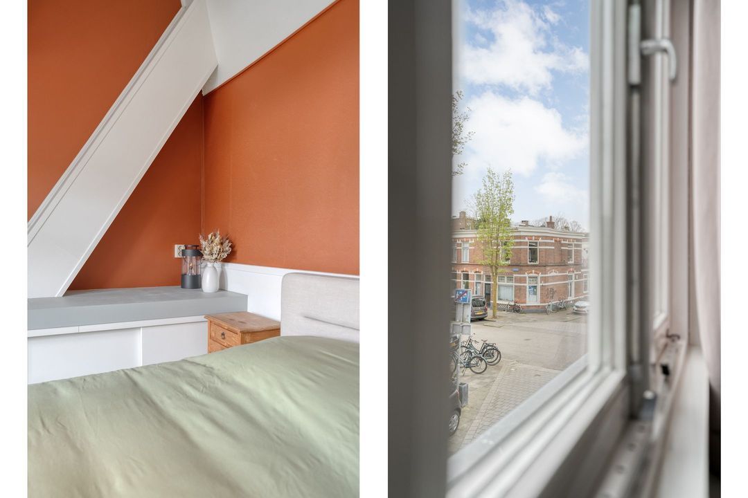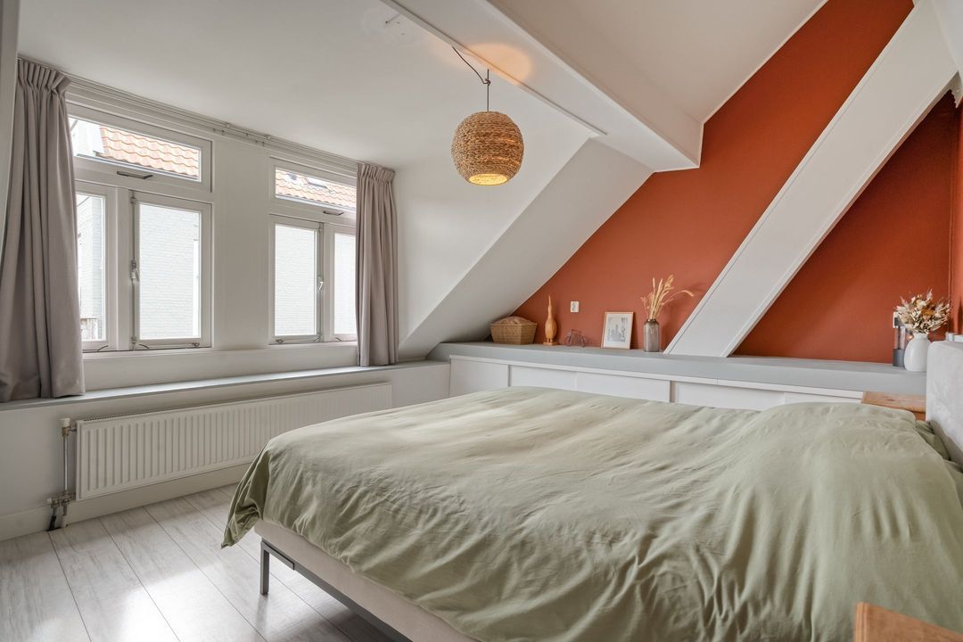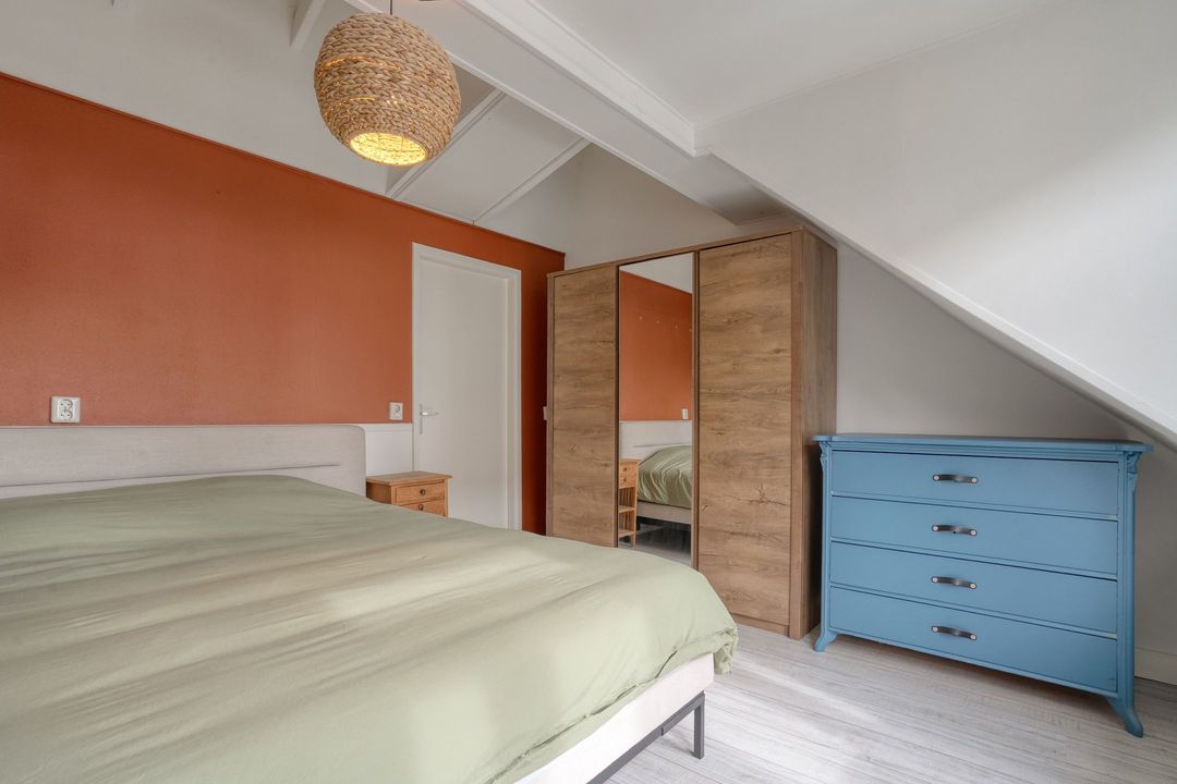 Aan de voorzijde is de grootste slaapkamer gesitueerd. Door het kleurgebruik komen het lijnenspel en de hoogte van het plafond mooi tot uiting. Langs de wand is een kast op maat gemaakt, een fraai decor. De dakkapel zorgt voor veel lichtinval. Vanuit de slaapkamer is via de vlizotrap de bergzolder te bereiken.