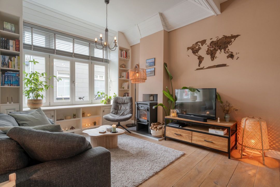 Aan de voorzijde is de woonkamer gesitueerd. Door het glas in de lood in de hal, ving je er al een blik van op bij binnenkomst. De prachtige ronde deur biedt toegang tot deze heerlijke ruimte. De fraaie houten vloer geeft een warme uitstraling. De diepe vensterbank met kastenombouw is een fijn plekje om tot rust te komen. Met een goed boek en een glas wijn, meteen naast de haard.