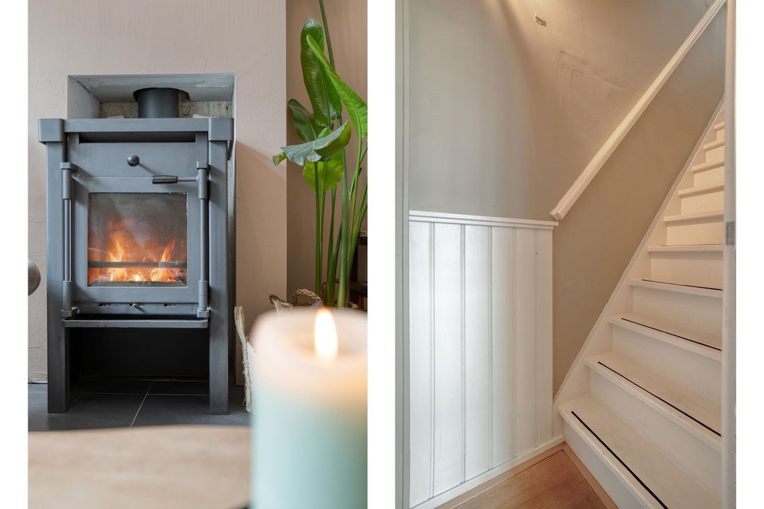 Onder de trap bevindt zich praktische bergruimte. Ook is vanuit de woonkamer, via een luik in de vloer, de kelder te bereiken. De trapopgang naar de verdieping bevindt zich achter de paneeldeur met glas-in-lood. Het kleine halletje geeft vanuit de woonkamer toegang tot de verdieping. Zo blijven de warmte én het geluid beneden.