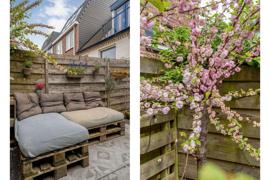 De achtertuin ligt op het west/noordwesten. Een achterom is er niet, terwijl dat wel zo lijkt. Ook hier is in de aanleg de sfeer het centrale aspect geweest. Een leuke afwisseling tussen terras en beplanting. Ook hier weer de gewerkte tegel die het geheel wat breekt. De pastelkleur van de schuur met de prachtige lampjes en de leuke boompjes. Kom maar op met die zon en dat glas wijn!