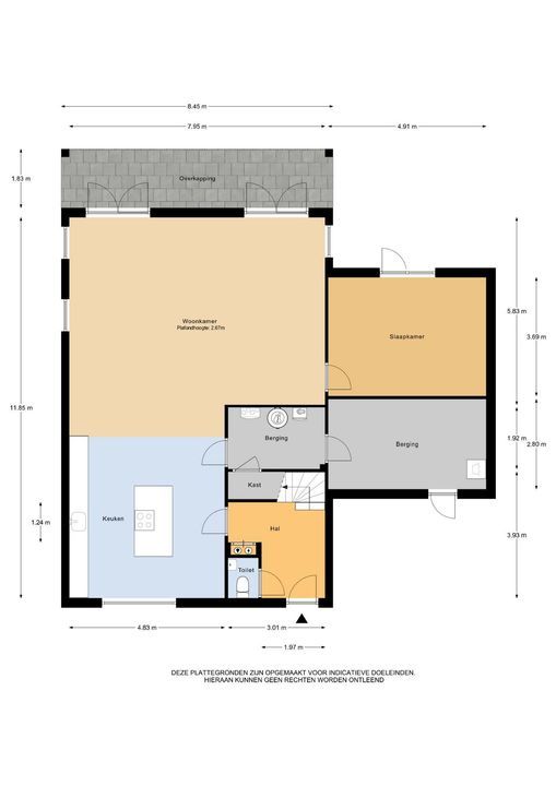 Begane grond: ruimtelijke entree/ hal met meterkast - toiletruimte met aansluitingen - trapopgang - royale living met tweemaal openslaande deuren naar het terras - toegang werk-/ slaapkamer met achteringang - inpandige berging/ technische ruimte met wasmachine aansluiting - inpandig bereikbare schuur.