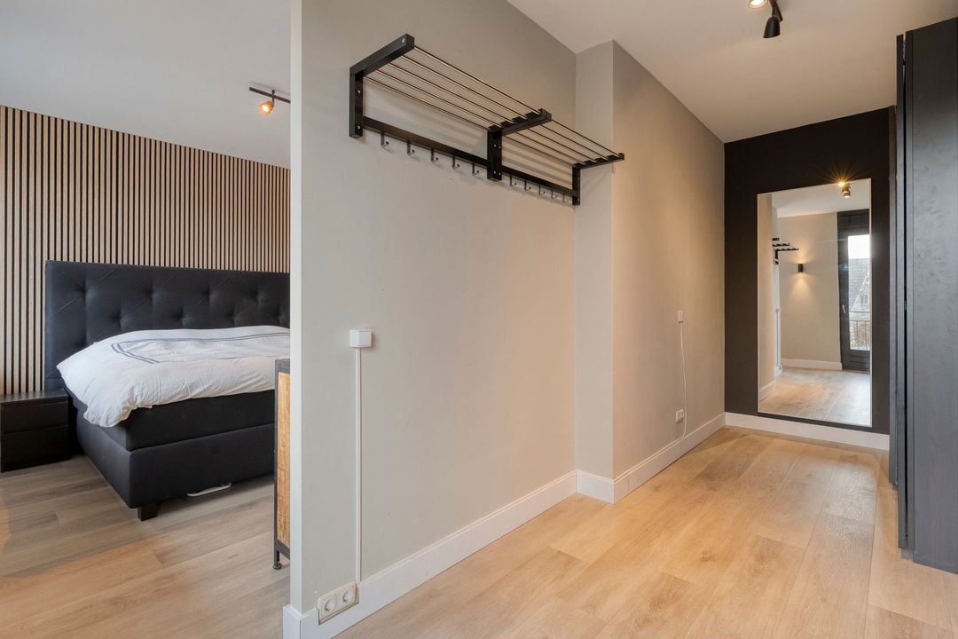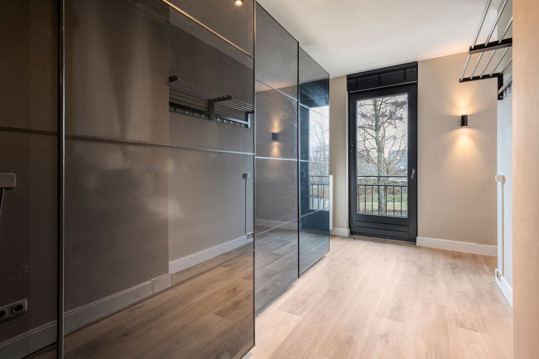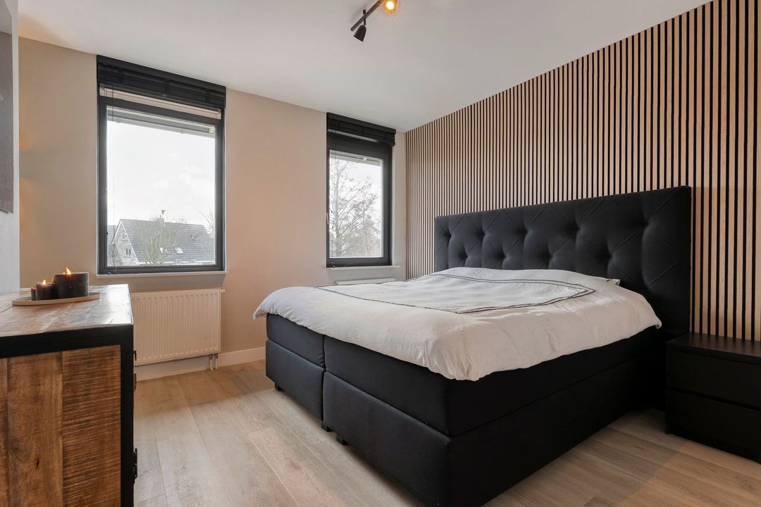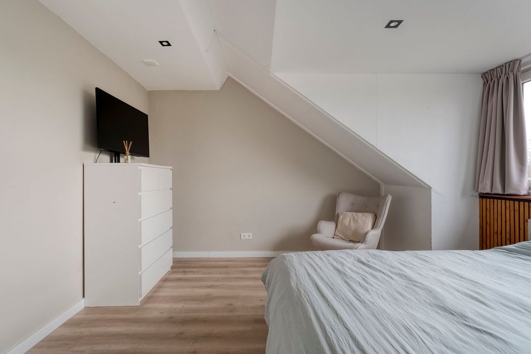 Via de stijlvol beklede trap bereik je de overloop. Deze geeft toegang tot twee slaapkamers en de badkamer. De L-vormige slaapkamer aan de achterzijde beschikt over een groot dakraam. Achter het knieschot is bergruimte. Ernaast bevindt zich de badkamer. Deze is voorzien van een ligbad, tweede wandcloset, een separate douche en een breed wastafelmeubel met dubbele kraan en laden. Ook hier zorgt een groot dakraam voor licht en extra ventilatie. De riante slaapkamer aan de achterzijde heeft een oppervlakte van maar liefst 25 m²! Vanuit de twee ramen en het Frans balkon is er ook van hieruit mooi zicht over het groen en water.