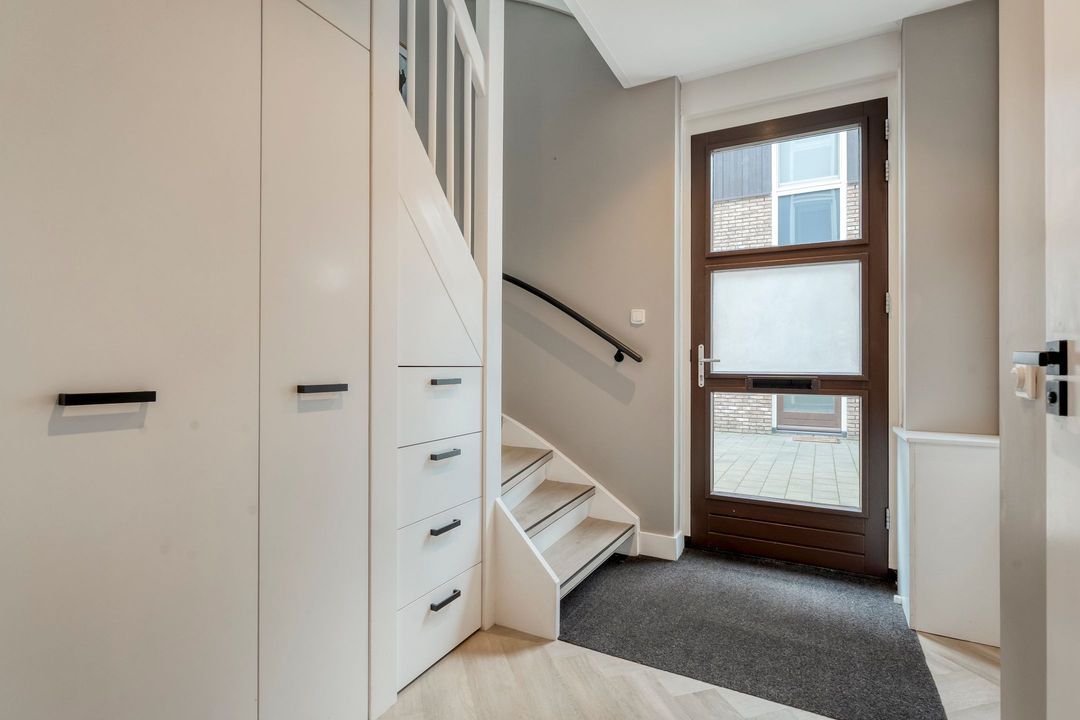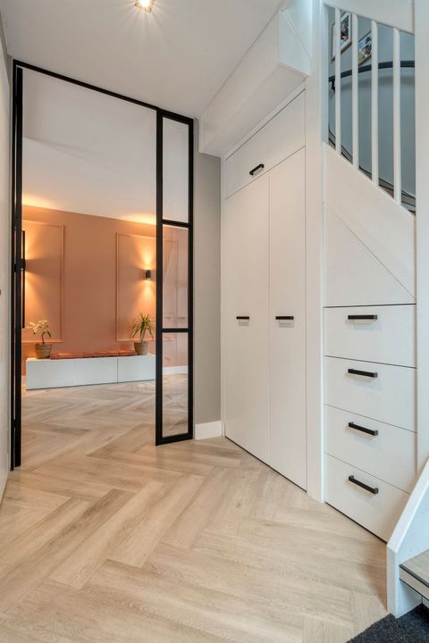 Onder de trapopgang is op praktische wijze de ruimte optimaal benut door op maat gemaakte kasten, gecombineerd met laden. De stijlvolle visgraad vloer met hoge witte plint zorgt meteen bij binnenkomst voor een warme en sfeervolle uitstraling. Vanuit de hal is het toilet te bereiken. Deze is voorzien van een wandcloset en een fonteintje.