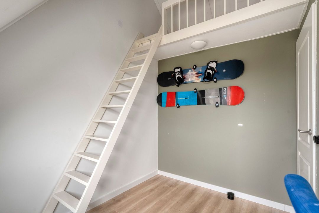 Op de tweede verdieping beschikt de woning over een dakkapel aan de voor- en achterzijde. Je komt boven op de voorzolder met de opstelling van de wasmachine en droger. Ook is hier een wasbakje aangebracht. De hybride cv-ketel is hier opgesteld, met ernaast de mechanische afzuiging. Aan de achterzijde betreed je de L-vormige slaapkamer, die de helft van de dakkapel benut. Achter het knieschot is bergruimte. Een vaste trap geeft toegang tot de vide met slaapplek. De vierde slaapkamer bevindt zich aan de voorzijde. Ook hier een grote dakkapel die de kamer prettig van formaat maakt. Aangrenzend een grote eigen inloopkast.